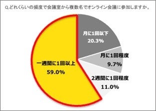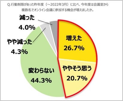 47.4%が、行動制限があった時期に比べ、リアルとオンラインを併用するハイブリット会議の実施が増加していると回答。約6割が、週に1回以上複数名で会議室からオンライン会議に参加
