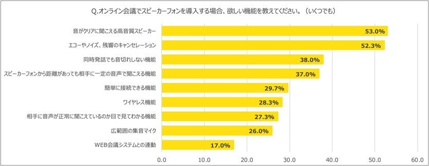 調査の結果、スピーカーフォンを利用が最も多かったものの、47.0%がPC内蔵スピーカー、40.3%がTV会議システムと、スピーカーフォン以外のデバイスを使用していることがわかりました。またスピーカーフォンに求める機能は、「音がクリアに聞こえる高音質スピーカー」「エコーやノイズ、残響のキャンセレーション」「同時発話でも音切れしない機能」がトップに挙がり、対面で話しているかのようなスムーズなやり取りができる高性能なスピーカーフォンが求められていることから、スピーカーフォンの導入にあたっては機能性や質を重視する必要がありそうです。