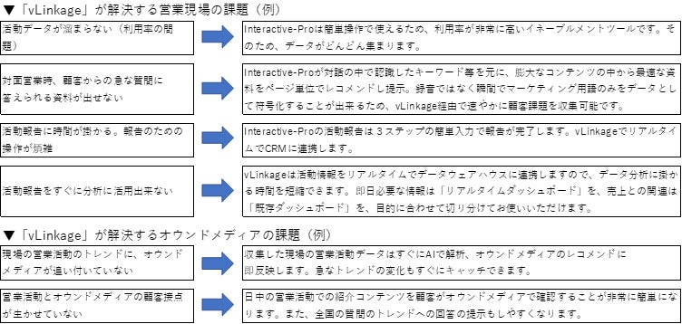 今回開発した「vLinkage」はInteractive-Proの各環境の利用情報を即座にクラウド環境へアップロードし連携するため、営業活動データの確認に要する時間を大幅に圧縮し、各環境間のデータ連携も自動化する画期的なサービスです。