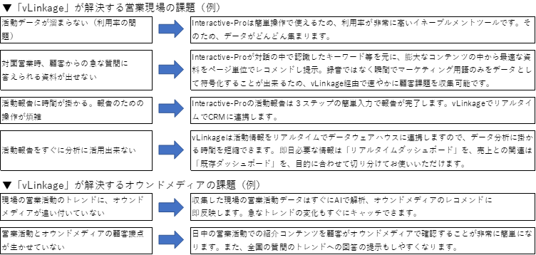 今回開発した「vLinkage」はInteractive-Proの各環境の利用情報を即座にクラウド環境へアップロードし連携するため、営業活動データの確認に要する時間を大幅に圧縮し、各環境間のデータ連携も自動化する画期的なサービスです。