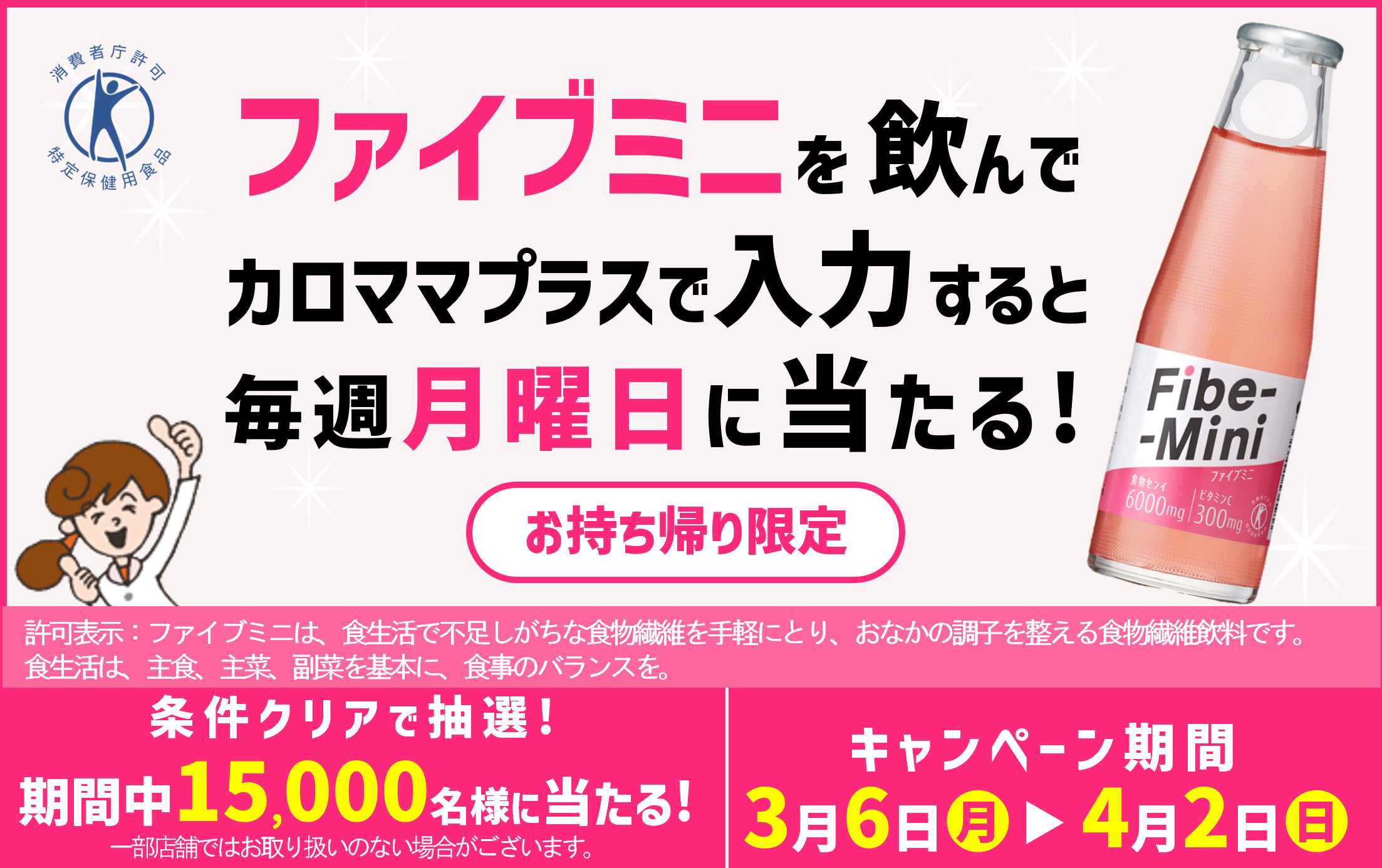 そこで本キャンペーンでは、食物繊維を意識して摂取するきっかけになるよう、レタス1.8個分(※3)の食物繊維を手軽に補給することができる「ファイブミニ(※4)」と、毎日の食事や運動・睡眠などのライフログにパーソナルAIコーチ「カロママ」がリアルタイムにアドバイスをお届けするアプリ「カロママ プラス」を組み合わせたキャンペーンを開催することといたしました。また、本キャンペーンは皆様により気軽に参加していただけるよう、コンビニエンスストアのローソンと合同で開催いたします。