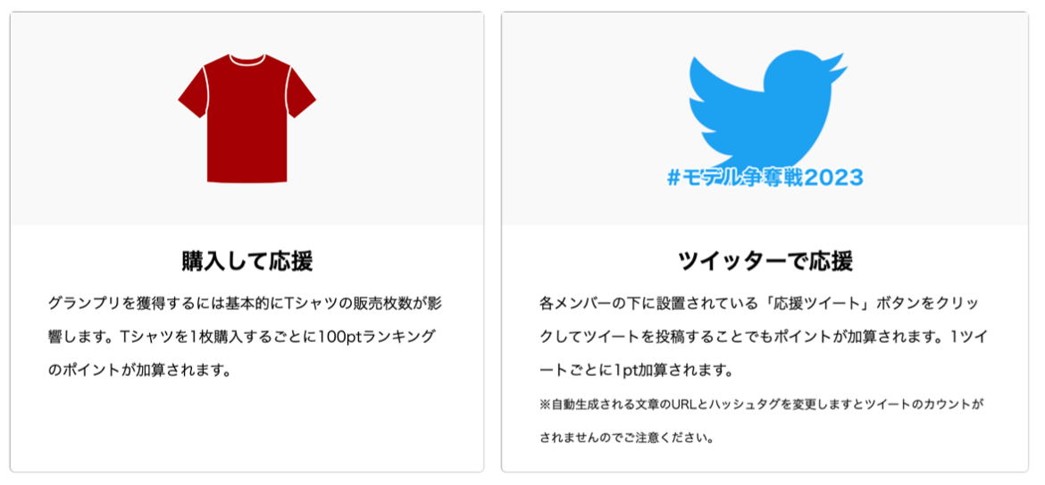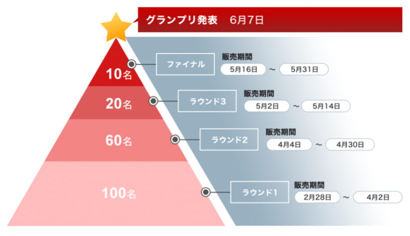 先選考は4つのラウンドに分けて行われ、各ラウンドの上位出場者が次のラウンドへと進出します。投票には購入と応援ツイートでの参加が可能で、アイテム購入1点あたり100pt 応援ツイートは特定のキーワードを含むツイートを行い1投稿あたり1ptの換算となります。