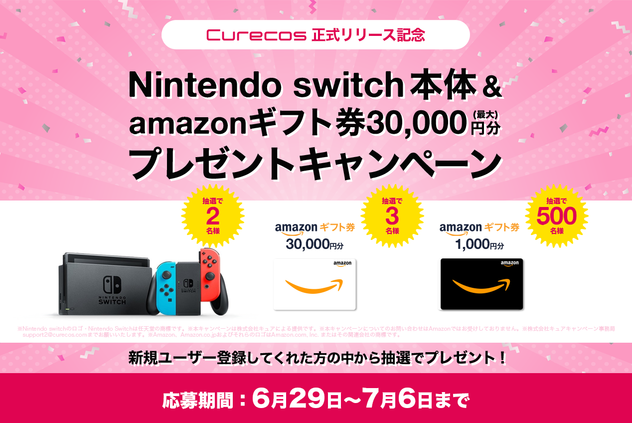 6月29日(水)から7月6日(水)までのキャンペーン期間中に、『Curecos』へ新規会員登録した方を対象に、先着で1,000円分のアマゾンギフト券を500名様に、抽選でNintendo Switchを1名、30,000円分のアマゾンギフト券を3名様プレゼントいたします。さらに、Cureウォレットに登録した方にはWチャンスとして2,000円分のCOTと抽選でNintendo Switchを1名にプレゼントいたします。