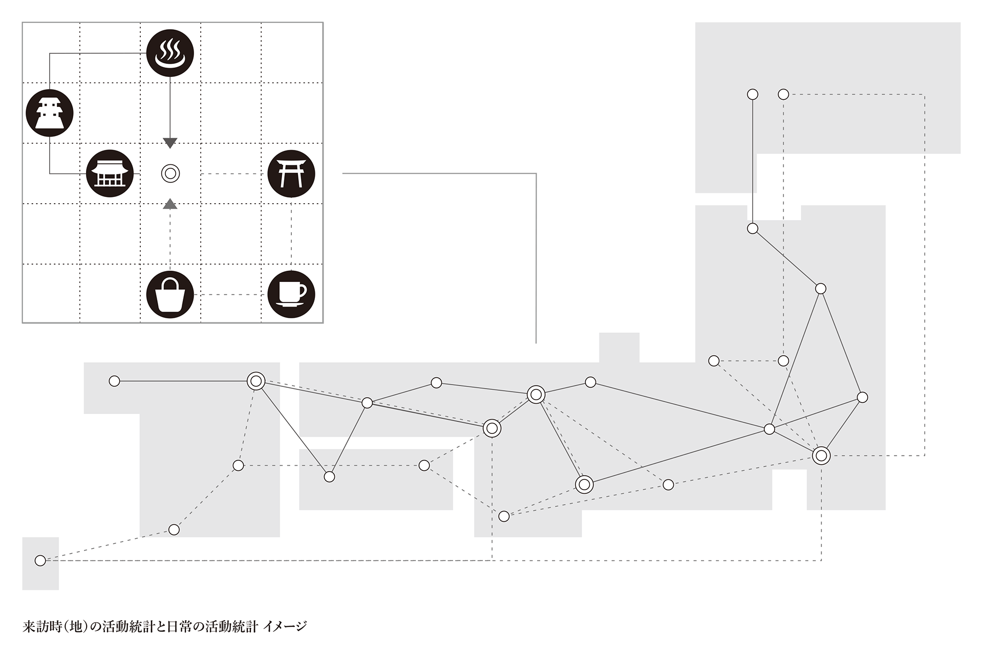 さらに、従来の分析範囲は調査時(地)周辺に限るものでしたが、本連携によって全国スポット情報を標準的に備えることで、単一の位置情報データから来訪時(地)周辺の活動の統計とそれ以外の日常における活動の統計(来訪前や来訪後の全国各地での活動)とを分離する、これまでにないペルソナ分析(特願2022-131333)が可能となり、趣味嗜好の異なるグループごとに、日常の統計=ペルソナと来訪時(地)の統計を比較することによる「なぜそのように行動するのか」という因果関係の推測や、全国をまたいだエリア・スポット間の関連性の把握が容易になります。