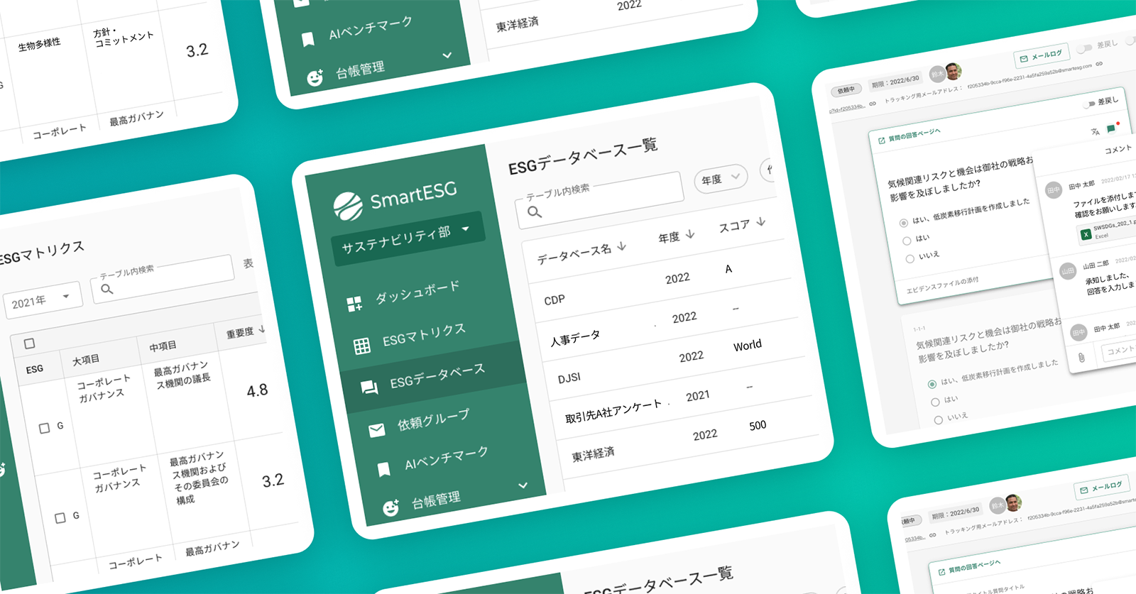 「SmartESG」は社内のESGデータを一元化し、企業のサステナビリティ活動の分析と改善を可能にするクラウドサービスです。「SmartESGワークフロー」によって外部評価機関や取引先から寄せられる情報開示依頼やアンケート回答作業を大幅に効率化し、社内に点在するESGデータを「SmartESGデータベース」に集約します。また、集約したESGデータを「SmartESGマトリクス」によって、各評価機関・開示基準が求めるESG主要項目毎にマッピングし、共通度合いや重要度を明らかにします。その上で 「SmartESGベンチマーク」によりベンチマーク企業の独自スコアリングと開示ベストプラクティスの特定を行い、導入企業様の市場からのESG評価の向上を促します。