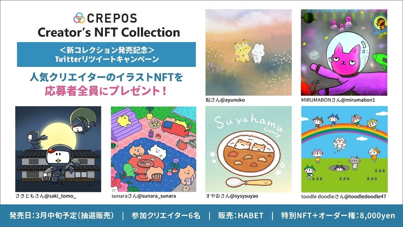 また、本コレクションに関して、CREPOS NFT支援プログラムの公式Twitterや各参加クリエイターのSNSで随時情報発信を行ってまいりますので、ぜひご覧ください。