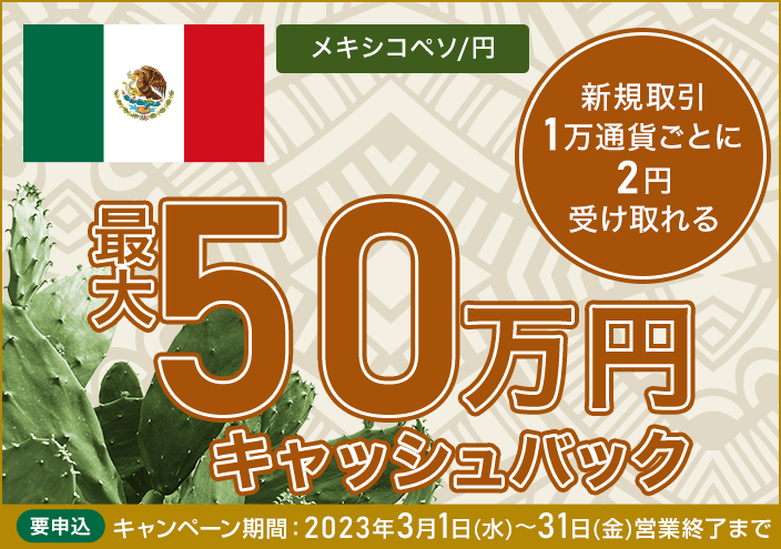 キャンペーンに申し込まれたお客さまに、期間中におけるメキシコペソ/円の新規取引合計数量に応じて、最大500,000円をキャッシュバックします。