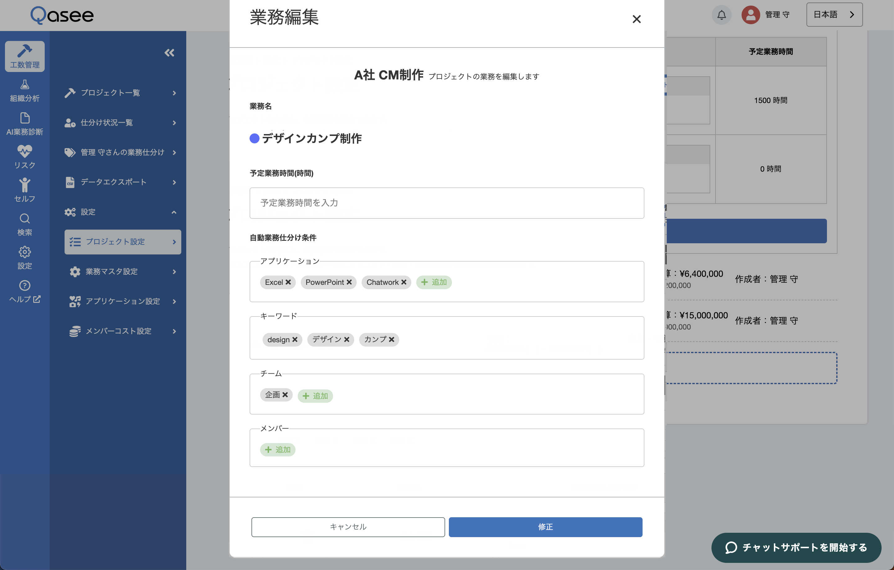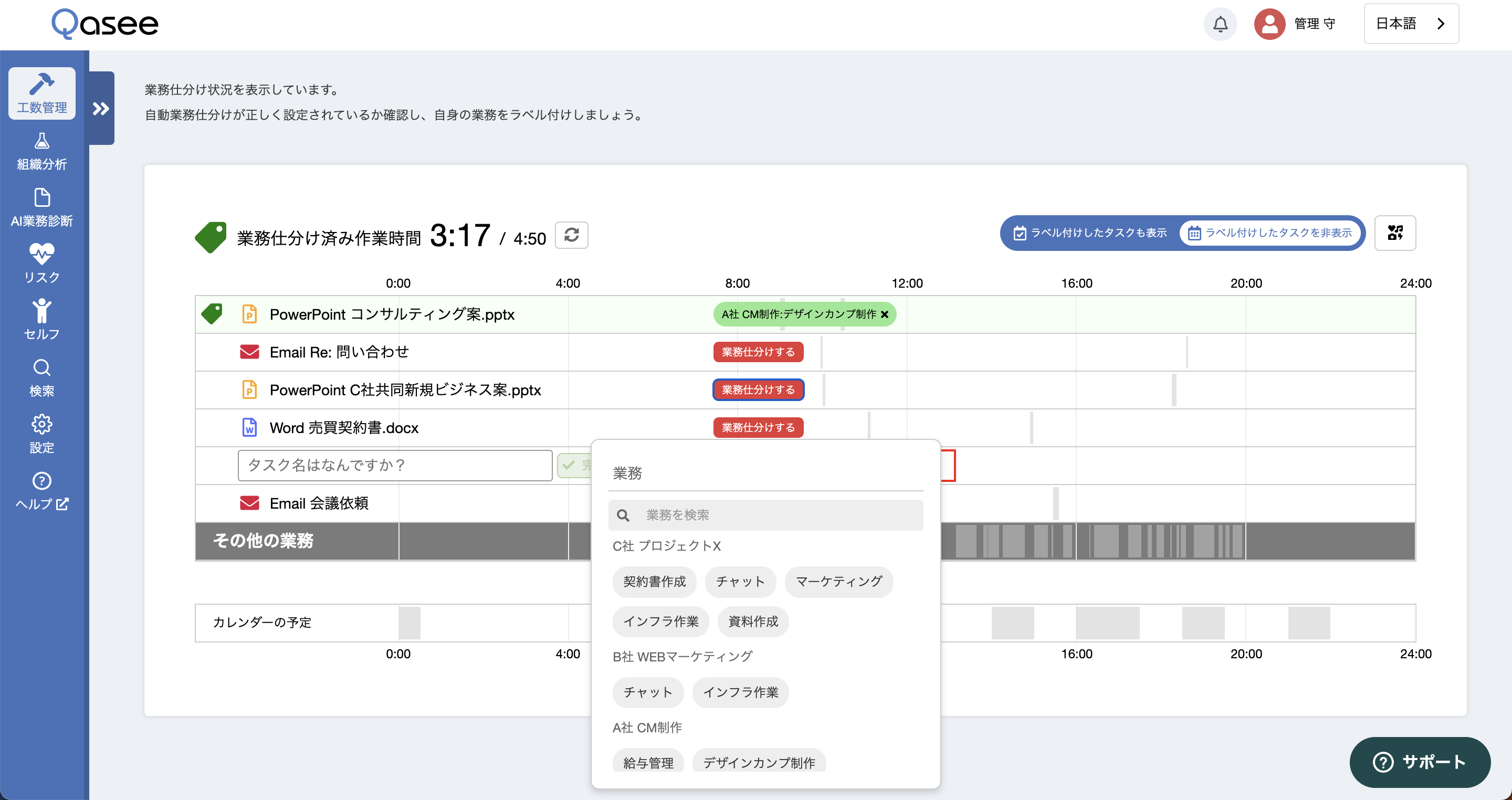 Qaseeでは、こうした不正確な自己申告のみの工数把握ではなく、業務PCから実際の業務データを自動的に抽出、どのプロジェクトの何の業務なのかをシステムに学習させることで、正確な業務コストを簡単に算出できるようになります。