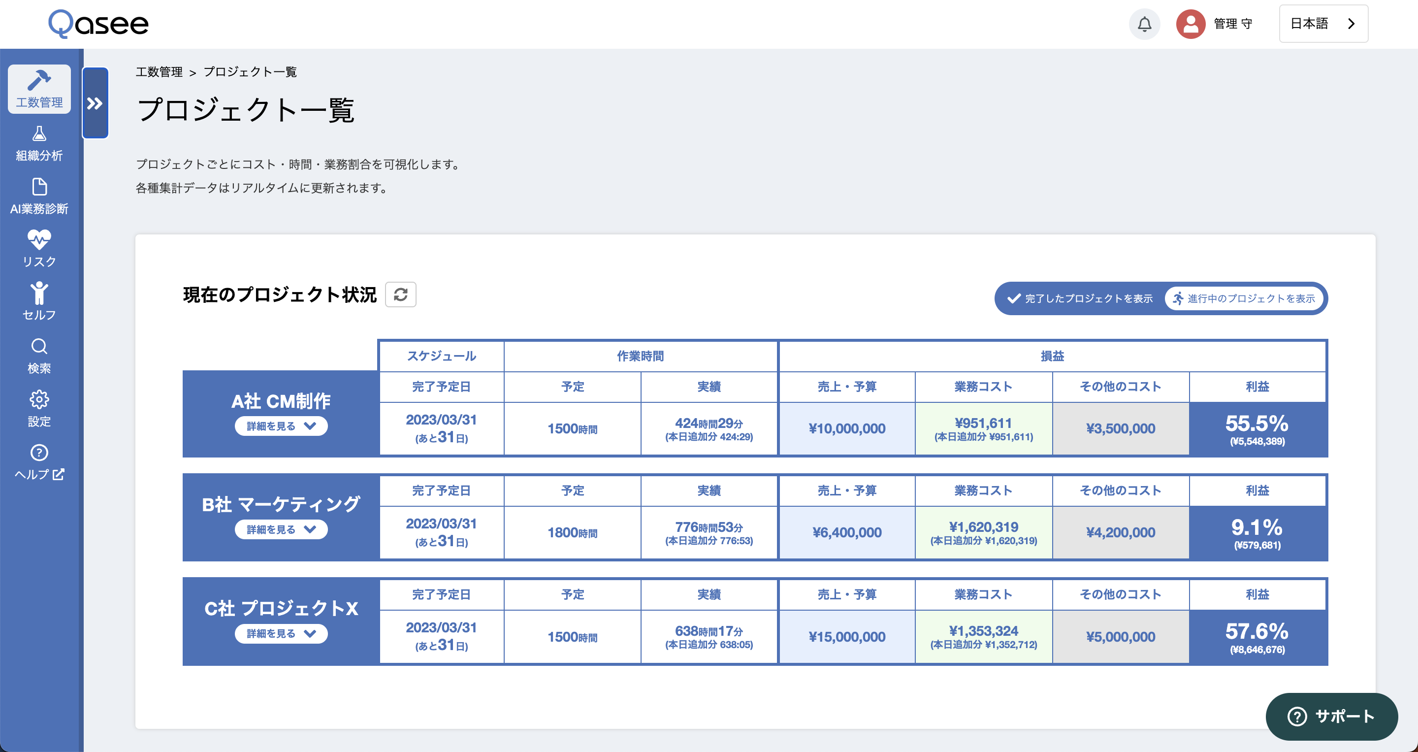 プロジェクト毎のトータル工数や利益率がひと目でわかるようになります。