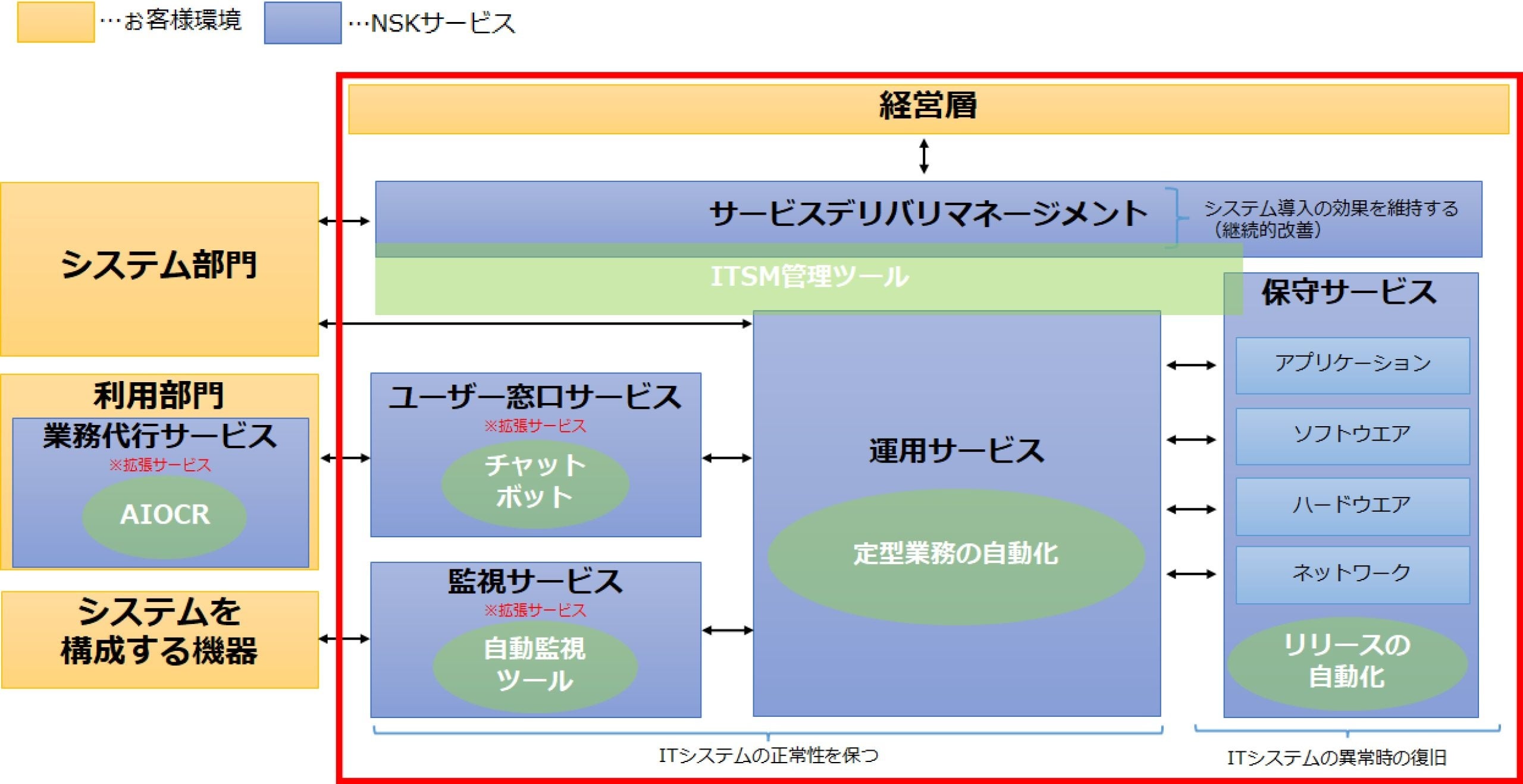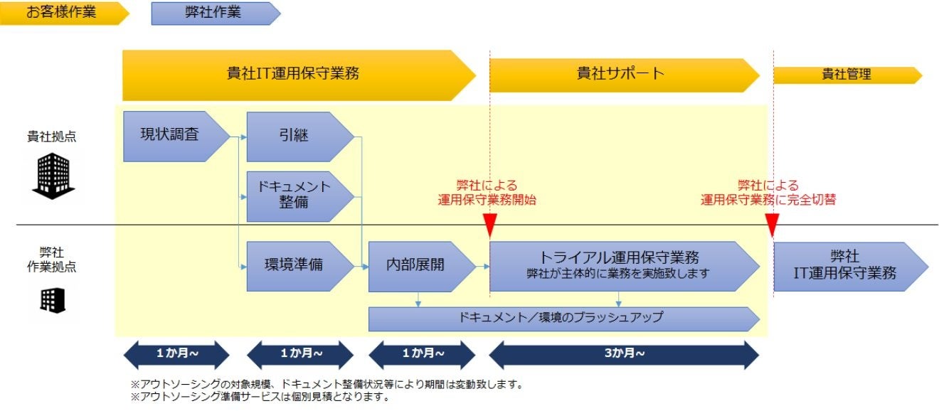 弊社のアウトソーシングサービスは、IT運用保守のベストプラクティス(ITIL)に基づいて構築されており、IT運用保守に必要となる機能を全て有しております。お客様が新たに機能を作成する必要ございません。