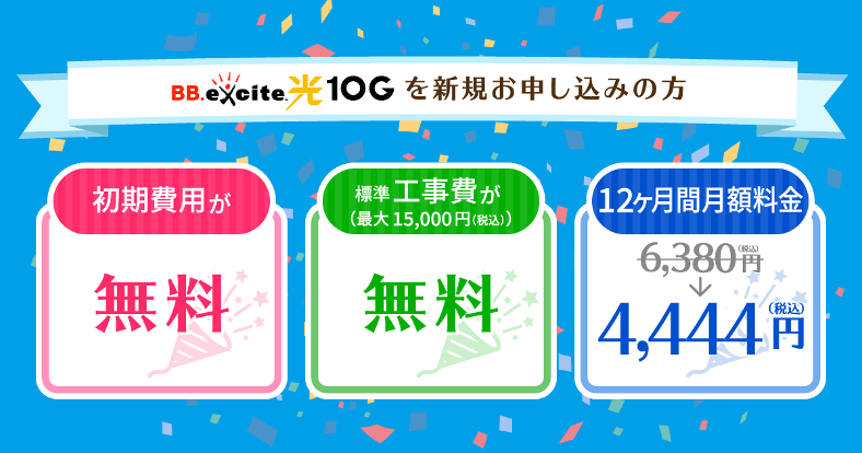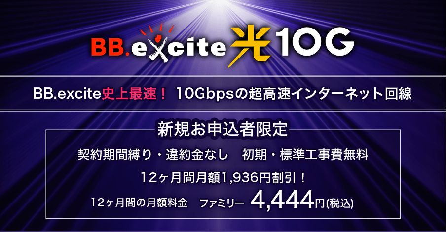 キャンペーン期間中に「BB.excite光 10G」を新規でご契約の方は初期費用・標準工事費無料&12ヶ月間月額割引が適用されます。