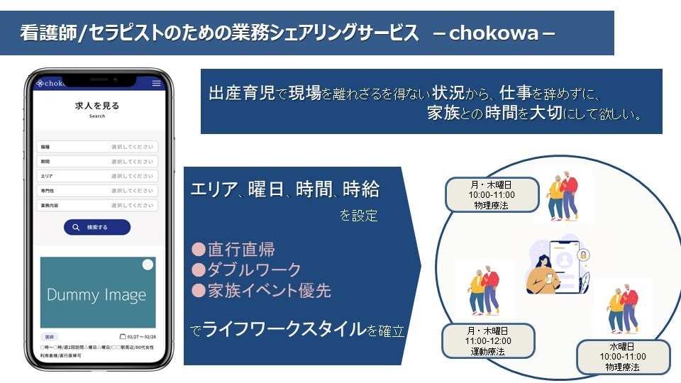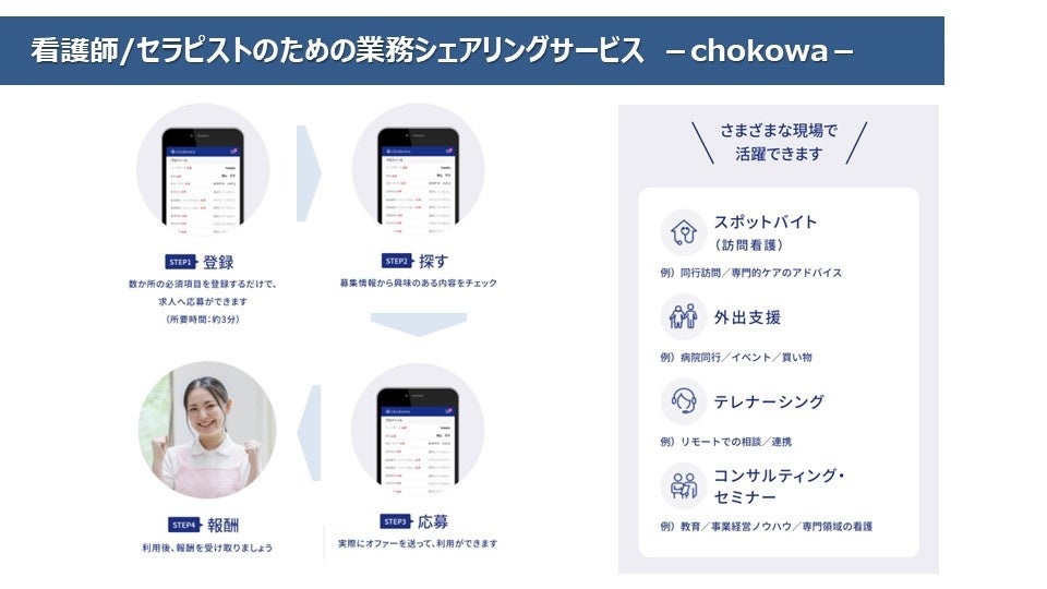 ※chokowa(チョコワ)とは、⼈材不⾜に悩む在宅医療介護事業者と、潜在看護師・潜在セラピストをマッチングするプラットフォームのことをいいます。スキマ時間を活用したい看護師/セラピストのマッチングサービスとして、登録者の居住地、スキルや希望勤務日などを設定し、スポットで働ける環境を提供します。
