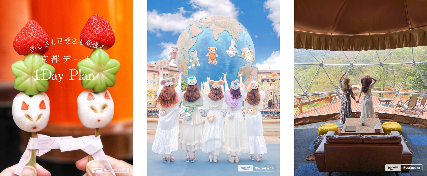 今回の調査では、旅先で友達やカップルと楽しめる現地での体験が多く回答を集めた。Lemon8の投稿傾向でも、着物を着ながら京都や金沢、浅草で「映えスイーツ食べ歩き」、「テーマパークでおそろコーデ」、「テントサウナ付きグランピング場」などが、新たなおでかけシーンとなってきている。また、おでかけファッションをさりげなく推し色にするなど、ファン同士だけに伝わる「推し活」も浸透しつつある。コンセプトや世界観があるおでかけが好まれやすい。