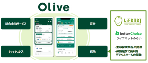 さらに、三井住友フィナンシャルグループ、三井住友銀行、三井住友カードは、2023年3月より、個人向け総合金融サービス「Olive(オリーブ)」の提供を開始しました。「Olive」は、銀行口座、カード決済、ファイナンス、オンライン証券、オンライン保険などの機能をアプリ上で組み合わせた総合金融サービスで、保険ポータルサイトへもシームレスに連携できるため、「Olive」をご利用のお客さまも当商品・サービスをご利用いただけます。