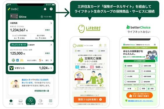 その業務提携の第一弾として、三井住友カードが提供するSMBCグループ会員向け保険ポータルサイト上で当社の保険商品の提供を開始するとともに、ライフネットみらいが運営する保険選びサイト「ベターチョイス」へのリンクを設置し、さまざまな保険商品の比較・検討を可能とする取組みを開始しました。