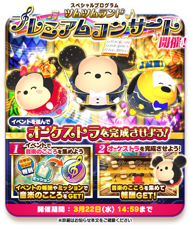 ぜひ、イベントに参加してツムたちによるオーケストラの演奏をお楽しみください。