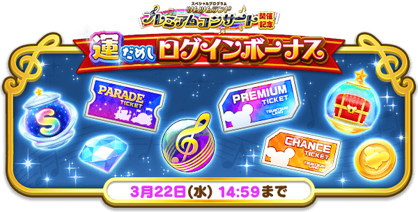 通常のログインボーナスに加えて、プレミアムチケットやスペシャルパレードチケットなど豪華アイテムがもらえる「運だめしログインボーナス」が開催中です。
