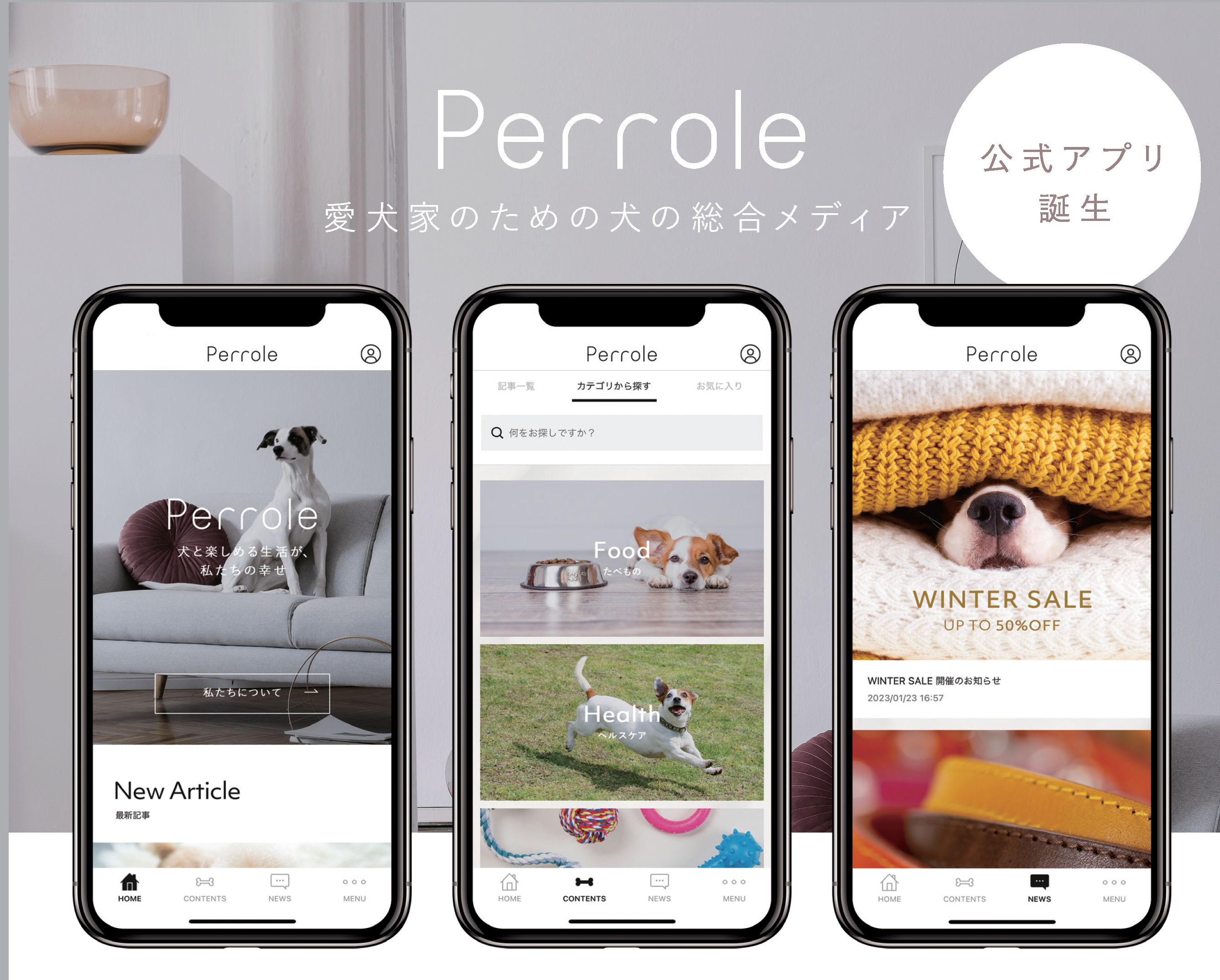「Perrole」は、「犬と楽しめる生活が私たちの幸せ」をコンセプトに、人とペットが家族として共に生活する中で必要な厳選した情報をお届けする『愛犬家のためのドッグライフ情報アプリ』です。犬×お出かけ、犬×食べ物、犬×ヘルスケアといった様々な記事コンテンツを通して、犬と一緒に楽しめる生活を過ごせる良質なサービスや商品の情報を、飼い主と愛犬のもとへ届けます。