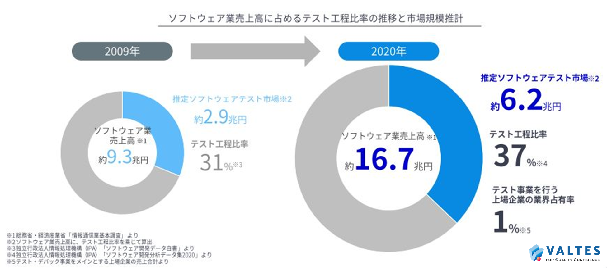 ソフトウェア開発工程のうち、約3~4割がテスト工程にあたるとされており、テストだけの市場規模は約6.2兆円です。ソフトウェア開発のアウトソース化が進んでいるにも関わらず、テスト専業企業の占有率は未だ1~2%に留まっている現状です。IT社会の進化に伴い、テスト検証へのニーズは今後も更に高まると予測されます。