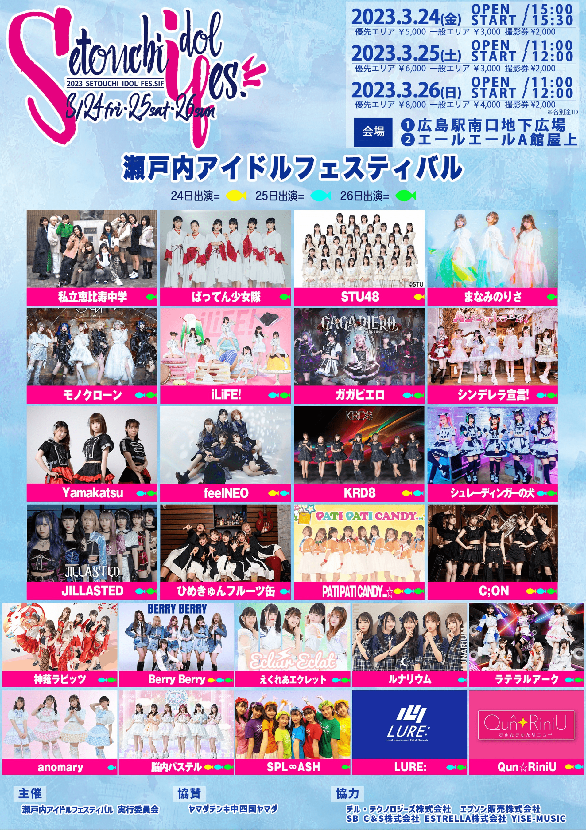2023年3月24日(金)・25日(土)・26日(日)に広島駅南口地下広場とエールエールA館屋上広場にて、瀬戸内地区を中心に、全国各地のアイドルグループが集結する「瀬戸内アイドルフェスティバル2023」が開催されます。