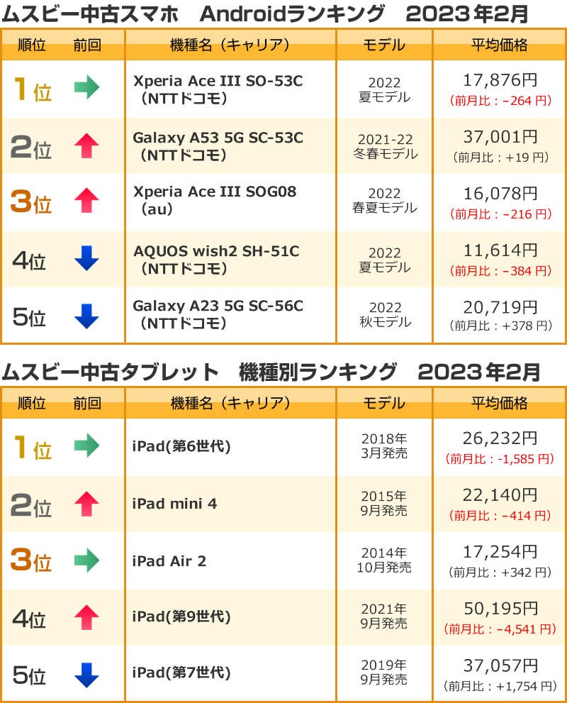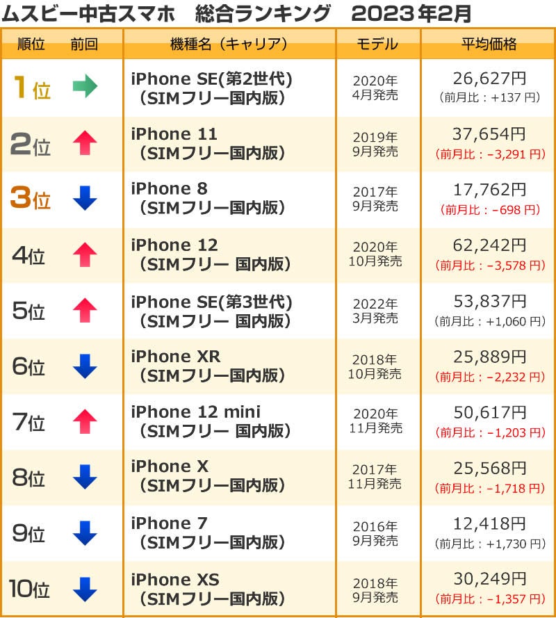 売上順位 / 機種名(キャリア)/ 平均価格※(前月比)