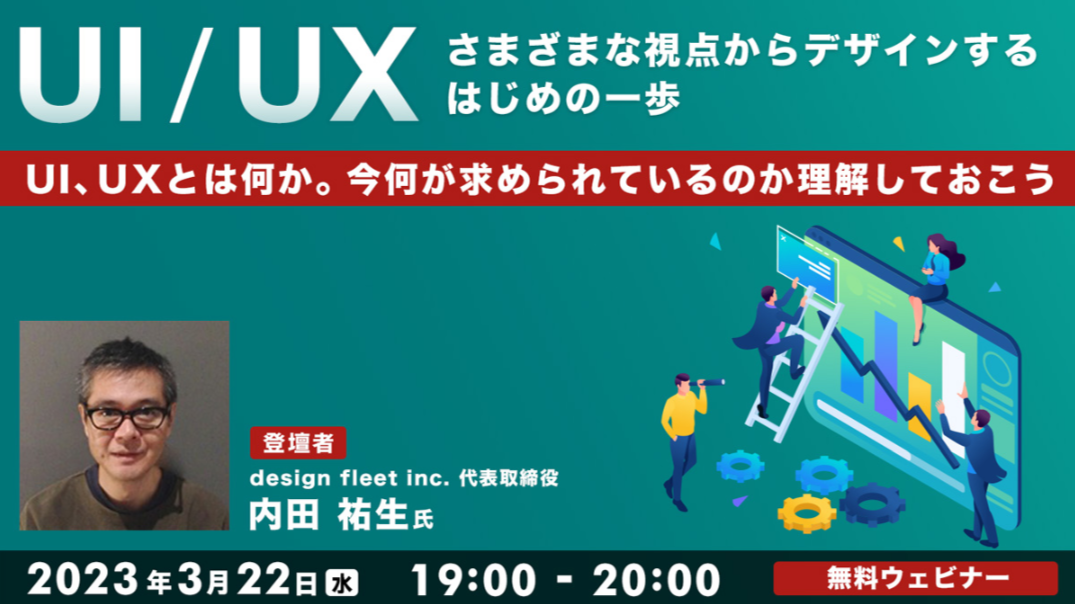 講師を務めるのは、デザイン教育・IT教育を専門に活動するdesign fleet inc.の内田祐生氏です。本セミナーでは、内田氏に、UI/UXとは何か、また、今WebクリエイターにUI/UXの何が求められているのかについてお話していただます。UI/UXデザイナーにシフトしていきたい方やUI/UXをきちんと意識してWebサイトを制作したい方などに特におすすめの内容です。