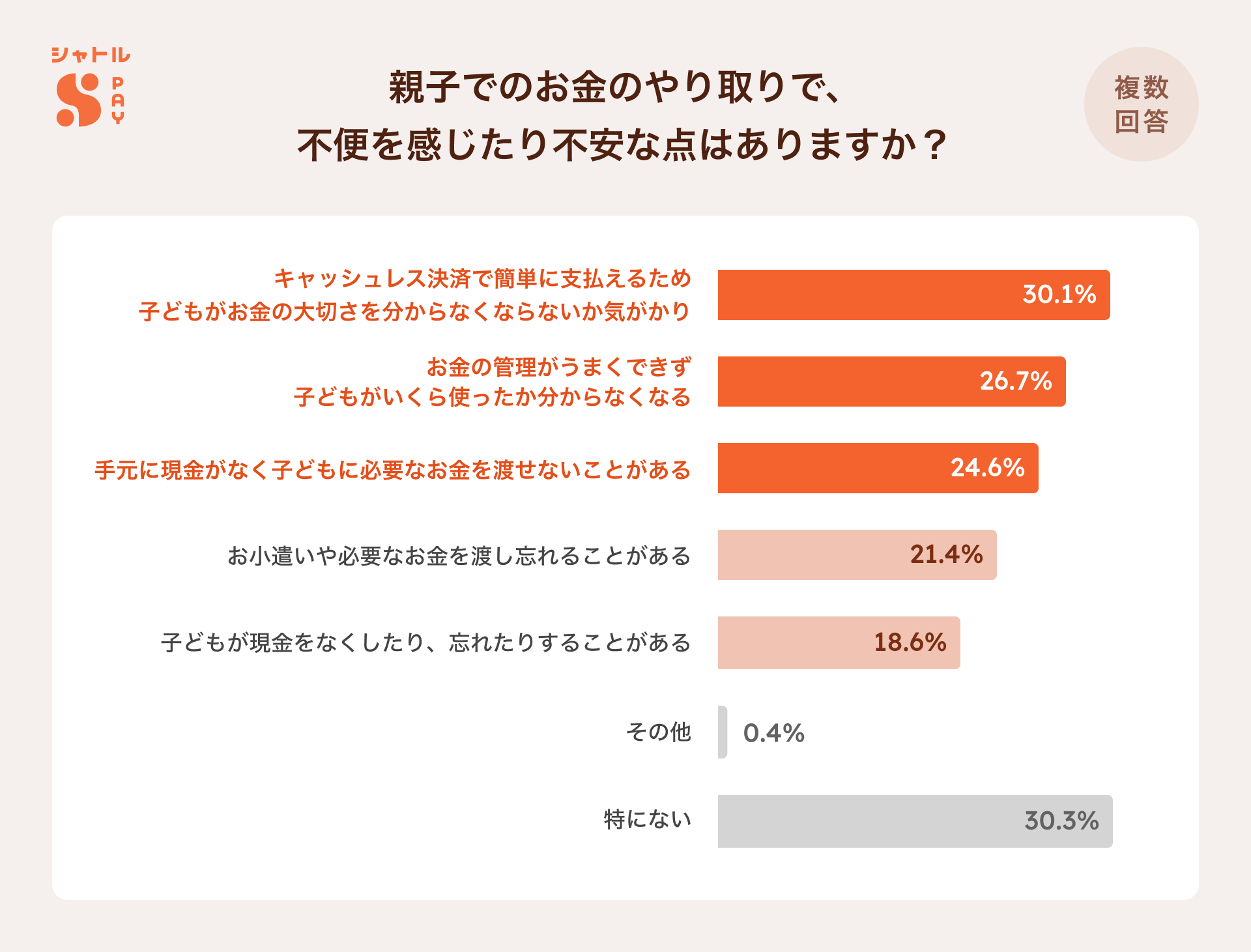 - 親子でのお金のやり取りで不便・不安な点の上位は、「キャッシュレス利用で、子どもがお金の大切さを分からなくならないか」「お金の管理がうまくできず、いくら使ったか分からない」「手元に現金がなくて、親が子どもに必要なお金を渡せない」