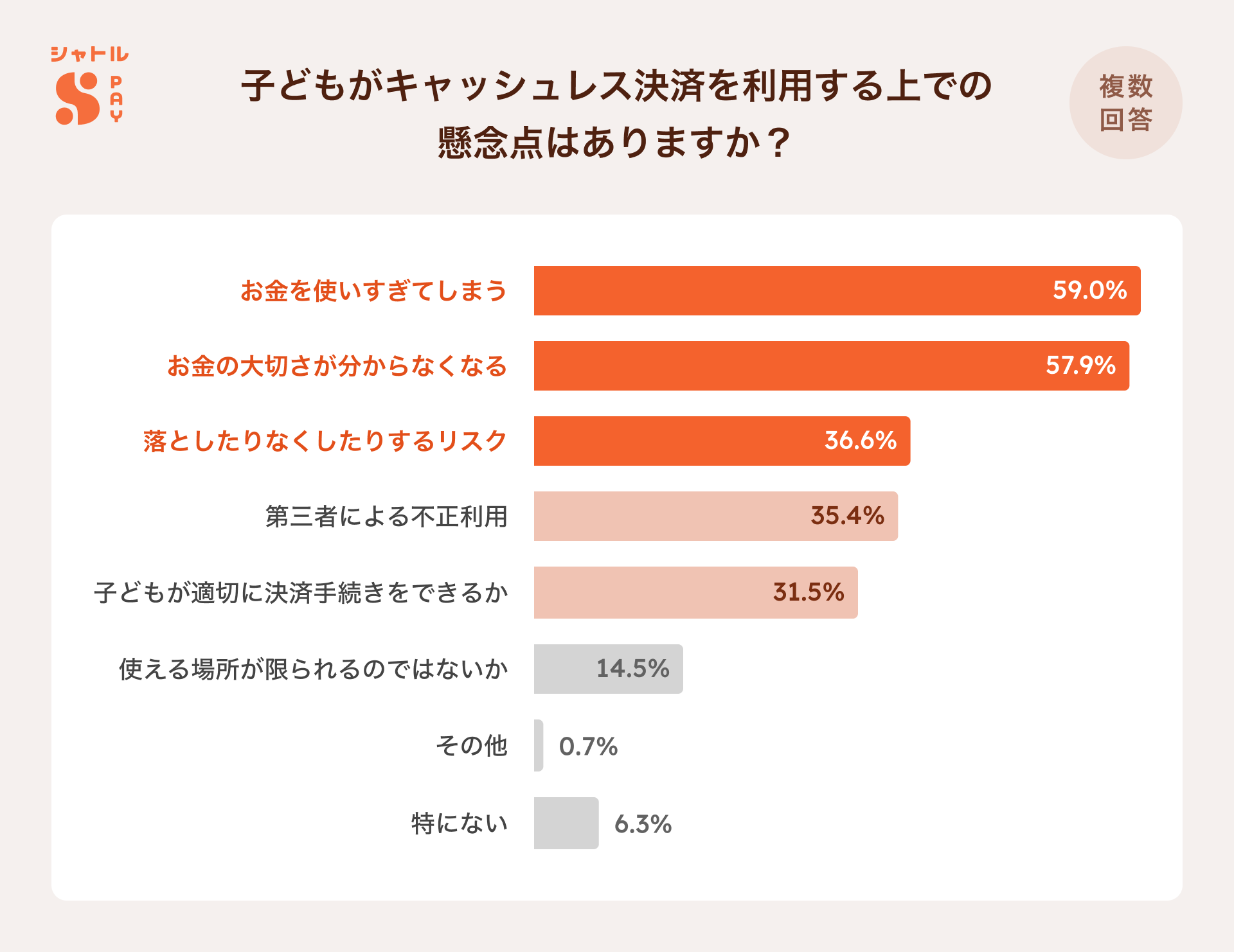 - 子どもがキャッシュレス決済を利用する上での懸念点上位は、「お金を使いすぎてしまう」「お金の大切さが分からなくなる」「落としたりなくしたりするリスク」