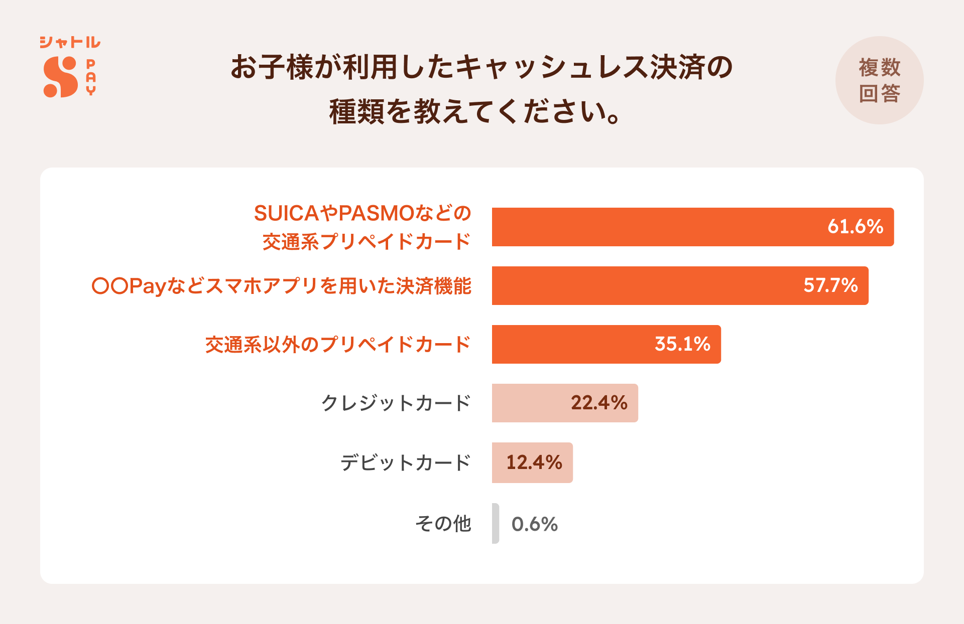 また、具体的に利用したことのあるキャッシュレス決済の種類を聞いたところ、「交通系プリペイドカード(61.6%)」「スマホアプリを用いた決済機能(57.7%)」「交通系以外のプリペイドカード(35.1%)」との結果を得ました。クレジットカードは22.4%、デビットカードは12.4%と、プリペイドカードやスマホ決済に比べて低い結果となりました。【図9】