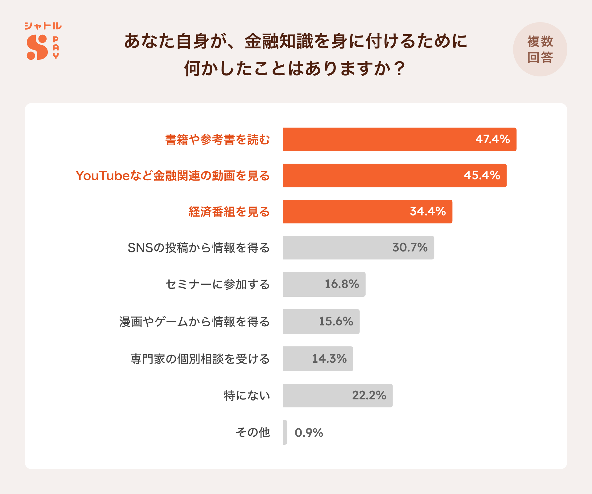 - 約8割が金融知識を得るために行動。上位は「書籍や参考書などを読む」「YouTubeなど金融関連の動画を見る」「経済番組を見る」