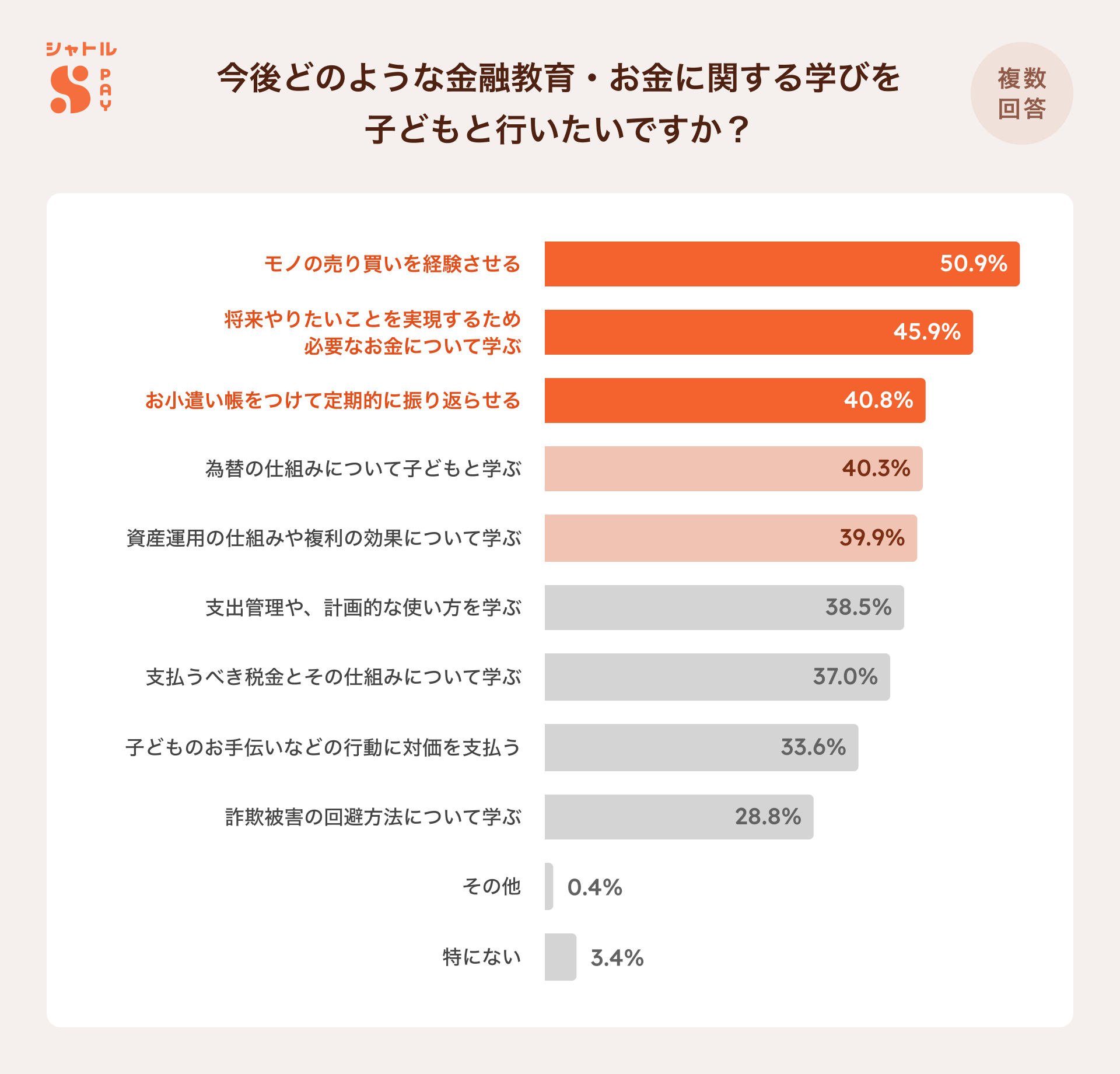 続いて、具体的にどのような内容の金融教育に興味があるか聞きました。結果、「モノの売り買いを経験させる(50.9%)」「将来やりたいことを実現するために必要なお金について学ぶ(45.9%)」「お小遣い帳をつけて定期的に振り返らせる(40.8%)」が回答上位となりました。さらに「為替の仕組みについて子どもと学ぶ(40.3%)」「資産運用の仕組みや複利の効果について学ぶ(39.9%)」と続き、小学校高学年〜中学生の親が子どもに対して、資産運用や為替の仕組みも含む、しっかりとした金融知識を身につけて欲しいと考えていることが伺えました。【図4】