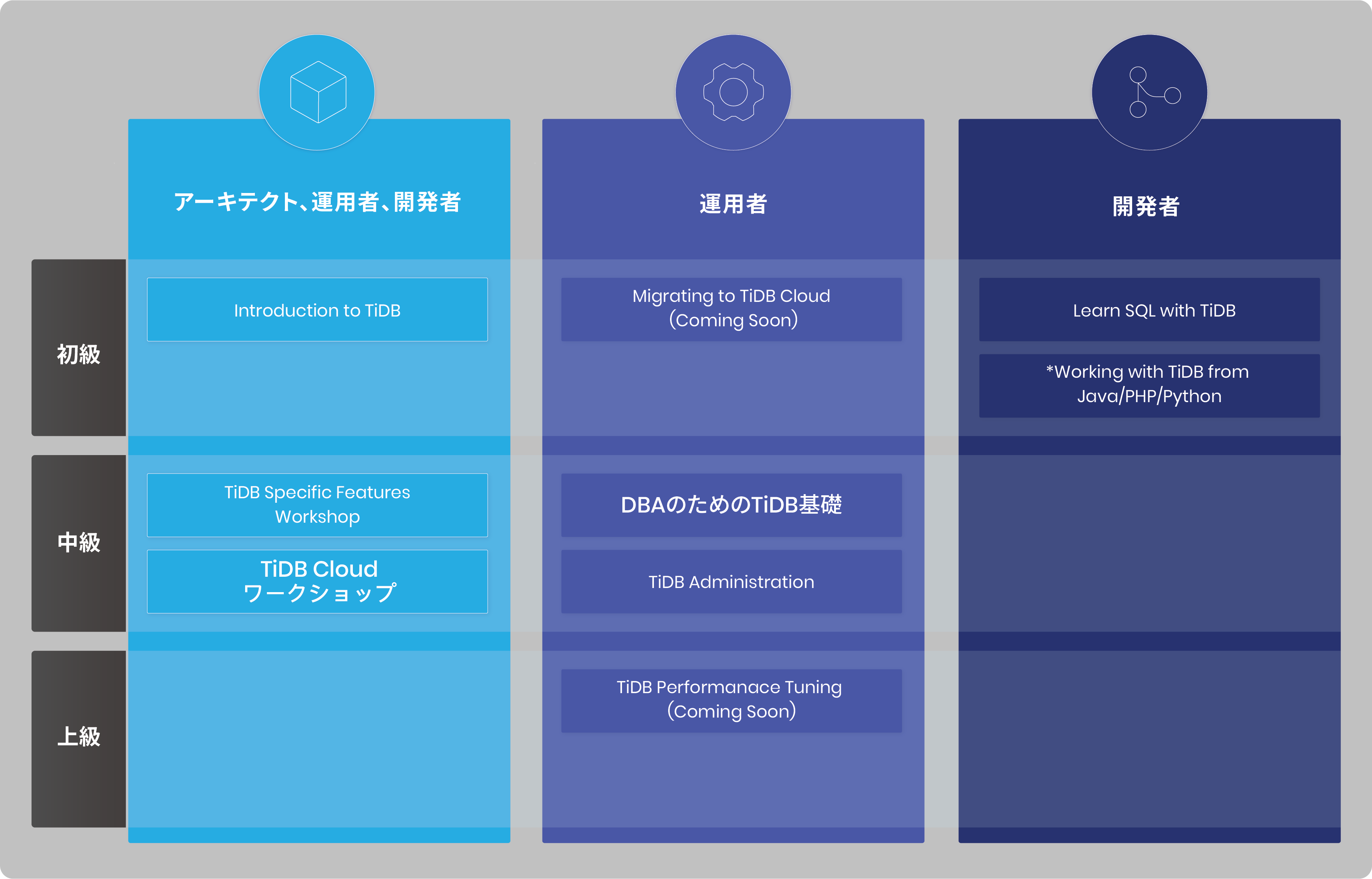 また、今後提供予定のコースには、TiDBの応用や開発者向けコンテンツが含まれており、幅広いトピックをカバーしたものとなっています。全てのコースはオンラインでの受講となり、地理的制限を受けずに学ぶことができ、またご自身のペースで好きな時に好きな場所で自由に学習を進めることができます。また、「DBAのためのTiDB基礎」のコースを終了した受講者向けに、TiDBの専門知識とスキルを認定する日本語の資格試験の提供も予定しています。