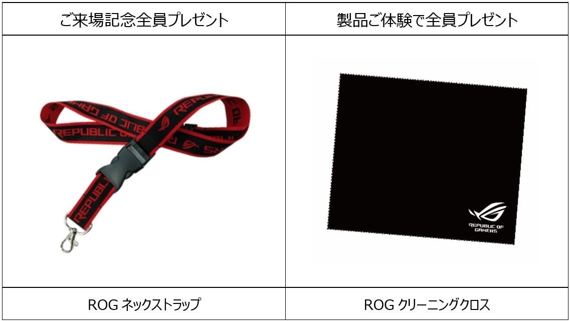 イベント期間中にソフマップなんば店 「ROG Gaming Zone」にご来場いただいたすべての方に対し、ROGロゴがプリントされた、「ROGネックストラップ」をプレゼント!!さらに製品をご体験いただいたすべての方に対し、オリジナル「ROGクリーニングクロス」をプレゼント!!