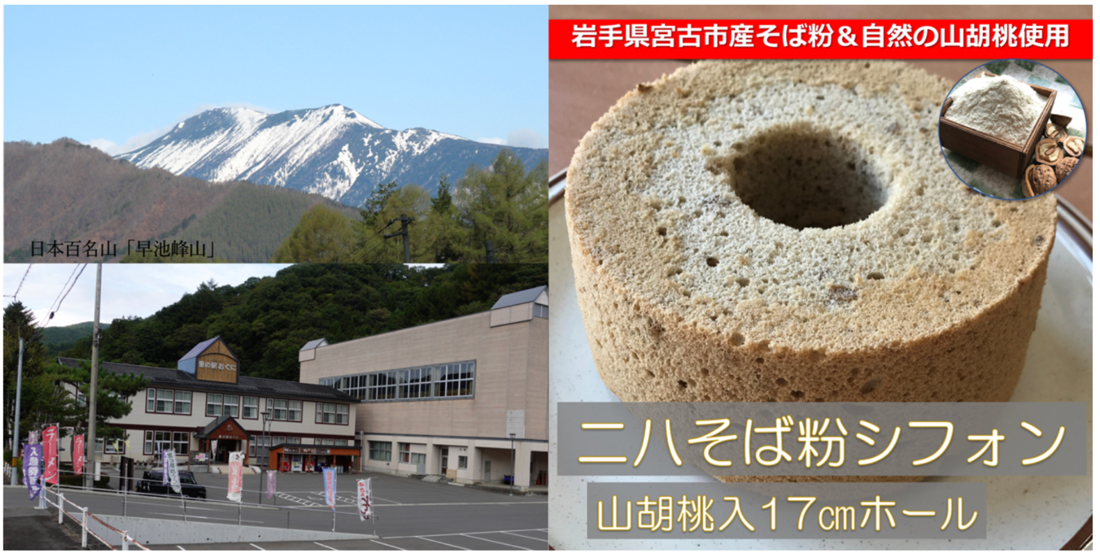 「里の駅おぐに」は岩手県宮古市の日本百名山「早池峰山」の麓、国道340号線のほぼ中心にあります。震災当時、内陸部と沿岸を結ぶ緊急輸送道路として活用されたことがきっかけとなり、旧小国小学校が里の駅に生まれ変わりました。名産のそばを活用して、みやこの田舎そば、山胡桃入そば粉のケーキを自力で商品開発し販売しています。