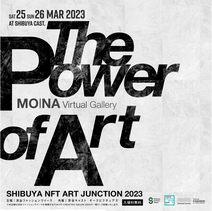 地域や民間企業が連携して、ファッション、アート、音楽、フード、カルチャーなど、様々なカテゴリーのイベントが一堂に集結する「TOKYO CREATIVE SALON 2023」内で開催される本イベントは、世界でも注目されているNFTアート・ファッションに注力した展示会です。作品が世に出る場を提供し、アーティストの支援、アート界の活性化を目的としており、渋谷から世界に発信します。会場となる「SHIBUYA CAST.」では、NFTプラットフォーム「MOSAIC NATION」(https://mosaic-n.com/) が厳選した作品が展示され、デジタルとフィジカル両方の作品を購入することが可能です。