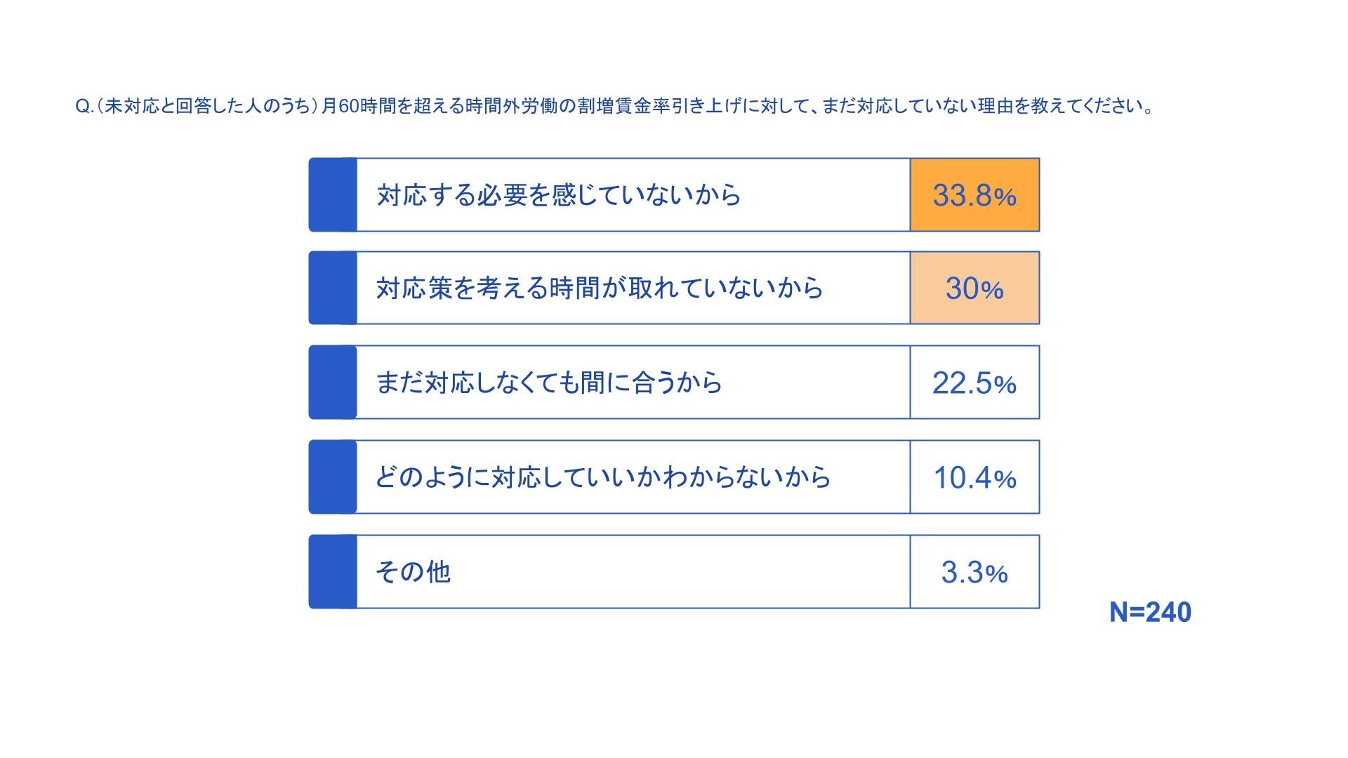 上記の設問で「未対応・不明」と回答した人へ、月60時間を超える時間外労働の割増賃金率引き上げに対して対応していない理由を問うと「対応する必要を感じていないから」が33.8%、「対応策を考える時間が取れていないから」が30%となりました。