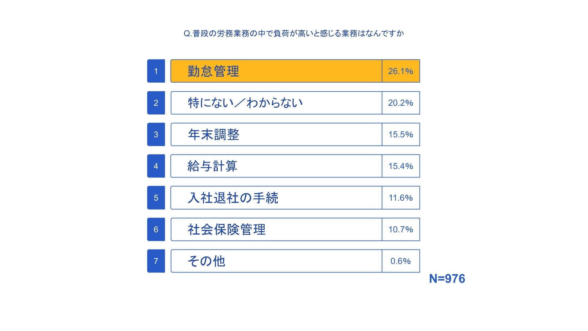 普段の労務業務の中で負荷が高いと感じる業務について全国の労務担当者に問うと「勤怠管理」が26.1%、「特にない/わからない」が20.2%、「年末調整」15.5%、「給与計算」15.4%、「入社退社の手続」11.6%、「社会保険管理」10.7%となりました。