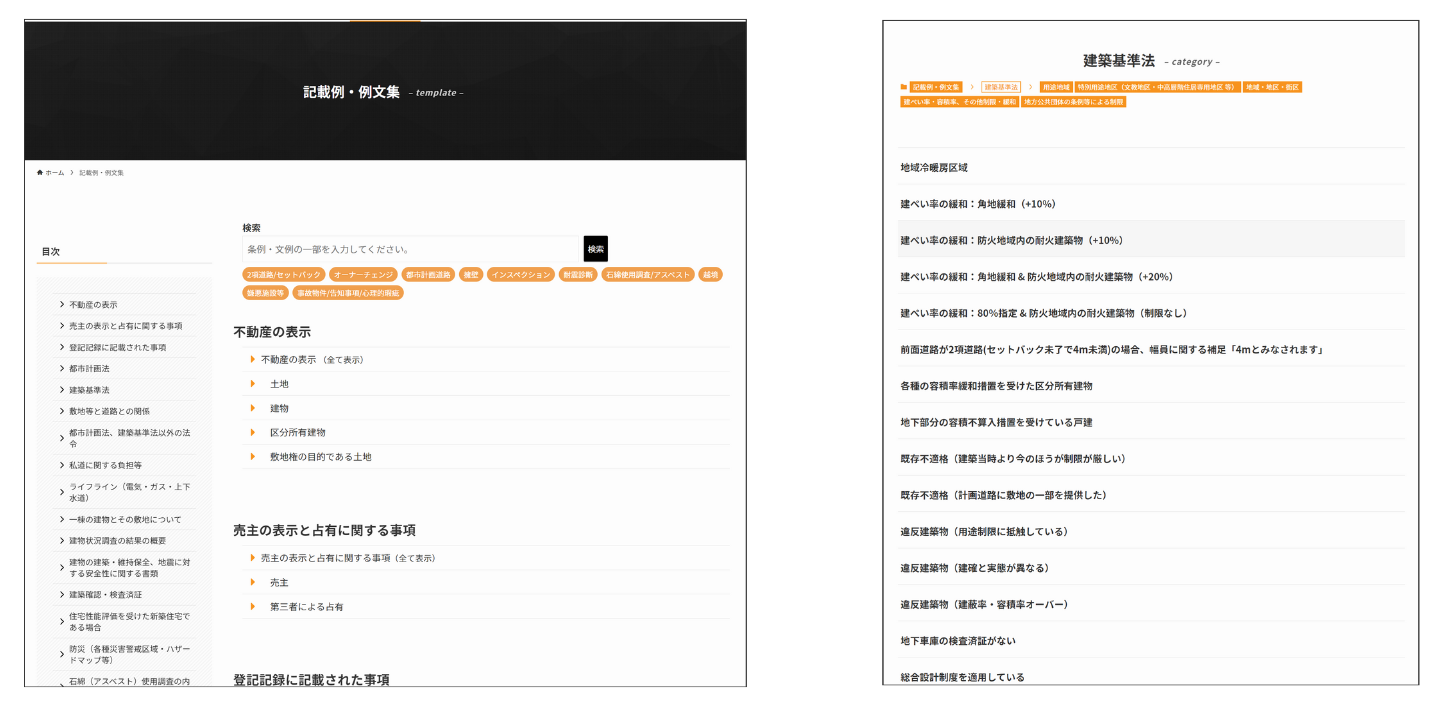 重説の作成時には、さまざまなパターンの説明文を記載する必要があります。多くの場合、現場での作成時には、所属する会社ごと、会社が所属する協会団体ごとに支給される「記載例・例文集」や「マニュアル」を参照しながら、作成したい内容に近しい例文を探す作業が必要になります。しかし、これらの資料は、まだまだ冊子であったり、Excelであったりと「検索しやすさ」に難がある場合が多く、また、それぞれの団体ごとに網羅性にも大きな差があるのが実情です。弊社では多数の不動産会社様のご協力の下、取材を進め、記載例・例文を体系的に取りまとめる試みを進めてまいりました。現時点では「ようやく500種に届いた」という状況ですが、今後も収集を続け「重説の百科事典」
