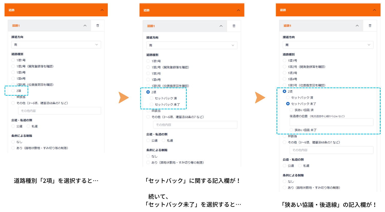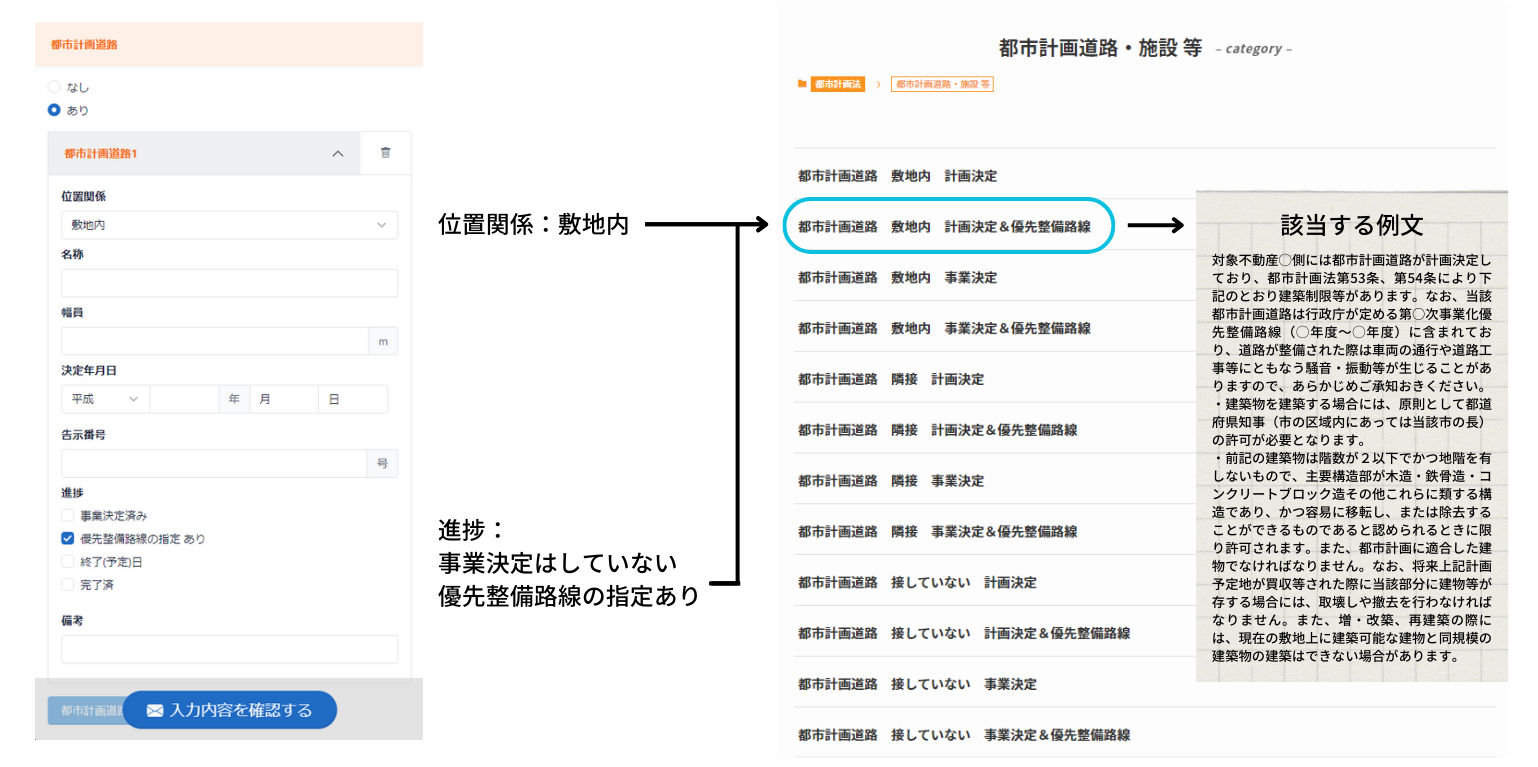 も実装予定です。(例えば、敷地内に都市計画道路があり、アプリに入力した場合、調査結果を出力したメールには「敷地内に都市計画道路がある場合」に重説の備考欄に記載しなければならない説明文の例を自動的に記載するような機能です。)