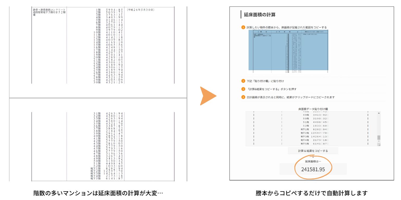 階数の多いマンションは延床面積を計算するだけでも一苦労です。各階の面積を電卓で足していくのも大変ですし「途中でタイプミスして最初からやり直さなければならなくなった」という経験は誰しもがあるのではないでしょうか。そこで、謄本から床面積の記載された部分をコピペするだけで、延床面積を自動計算するツールをご用意しました。タワーマンションの延床計算も簡単にできるようになります。