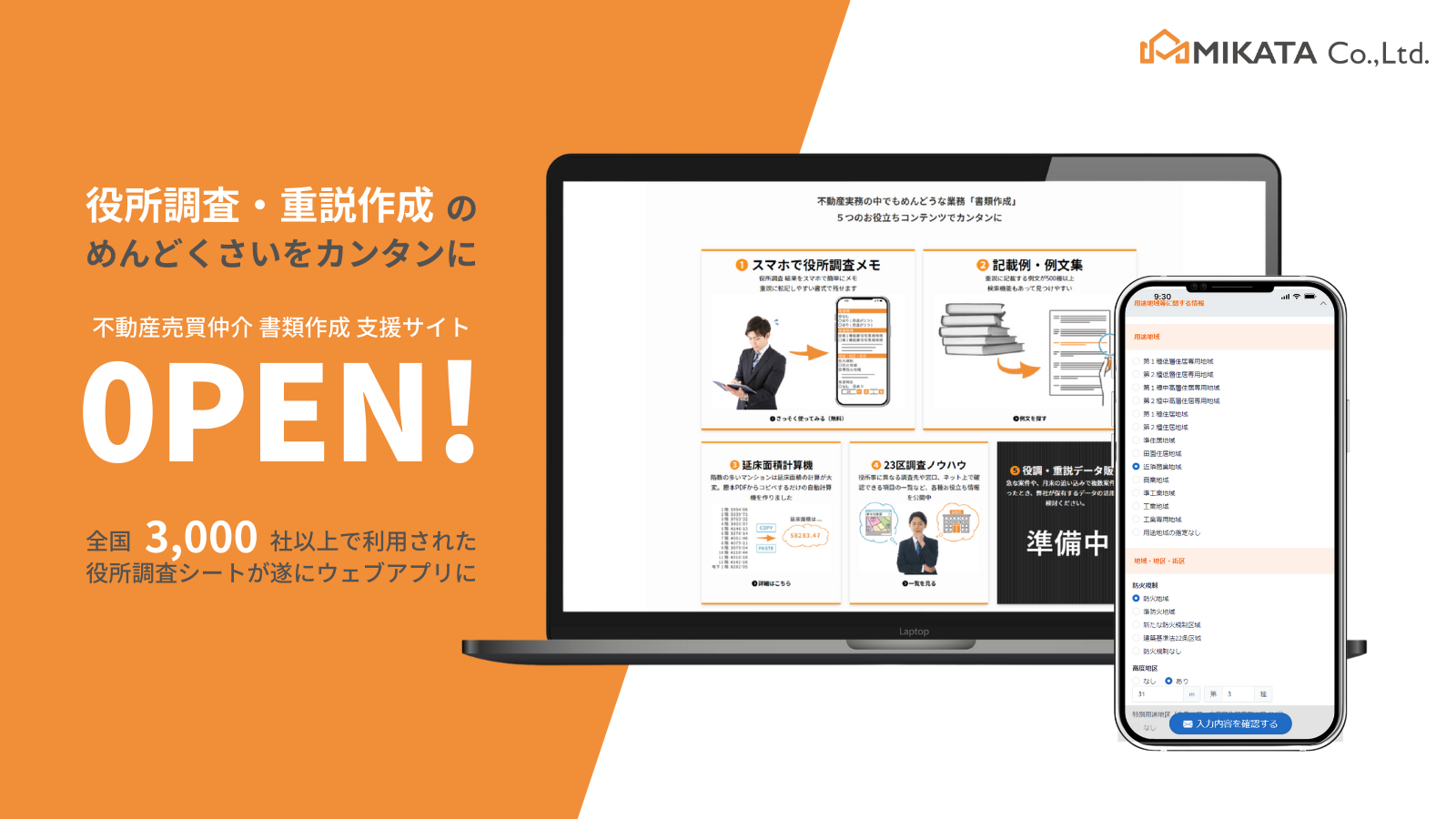 ミカタでは、役所調査の効率・精度を向上するために、調査項目をシートにまとめた「役所調査シート」の配布を以前から行っていました。利用者様からは「調査が楽になった」「書いてある項目を埋めるだけで、新人でも調査漏れがなくなった」など、大変ご好評いただいております。2023年2月現在、月間10万人以上にご利用いただく弊社サイトでも、このシートは最も累計ダウンロード数の多い人気コンテンツです。しかし、このシートも完ぺきではなく「記入したいことが多いと記入欄に入り切らない」「用途地域が複数のときはうまく書き込めない。しかたなく2枚使っている」といったご指摘も多くありました。