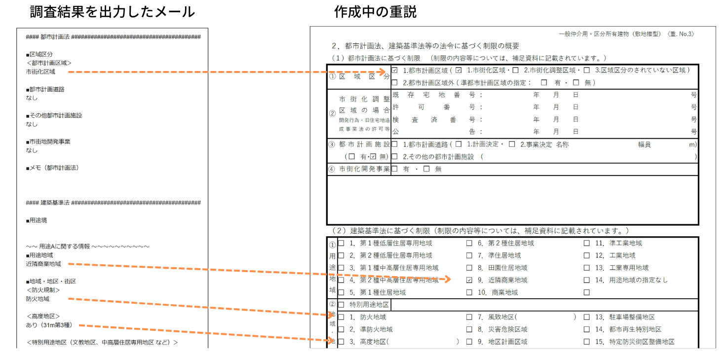 調査結果は任意のアドレス宛にメールで送付でき、なるべく重説の記載順に近い書式にしてあります。重説の作成時には、上から参照していくだけで作業が進むことを目指しているためです。