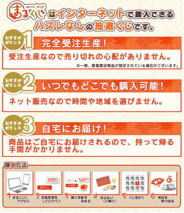 『まるくじ』はインターネットで購入できるハズレなしの抽選くじサービスです。各アイテムがすべて受注生産なので売り切れの心配はありません。(※)