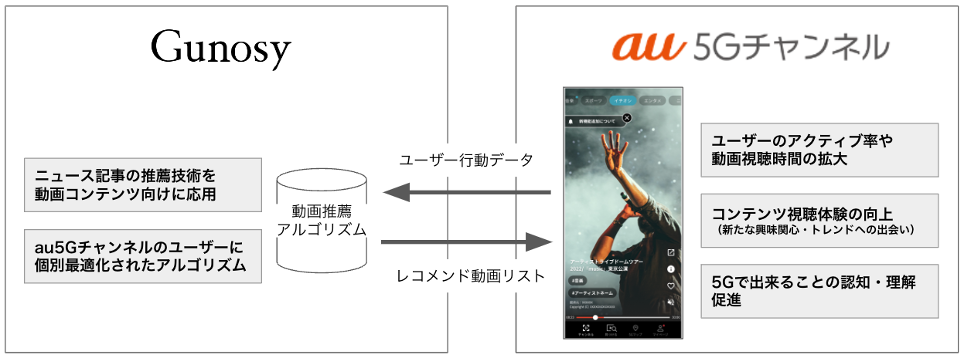 Gunosyには機械学習やデータサイエンスに精通したエンジニアが在籍しており、推薦アルゴリズムの自社開発、及びサービスに合わせた個別のチューニングにも対応が可能です。これまでのKDDIとの取り組みを通して知見を積み重ねてきたGunosyが、「au 5Gチャンネル」向けに最適化された推薦アルゴリズムを提供することで、コンテンツ視聴体験のさらなる向上を実現します。