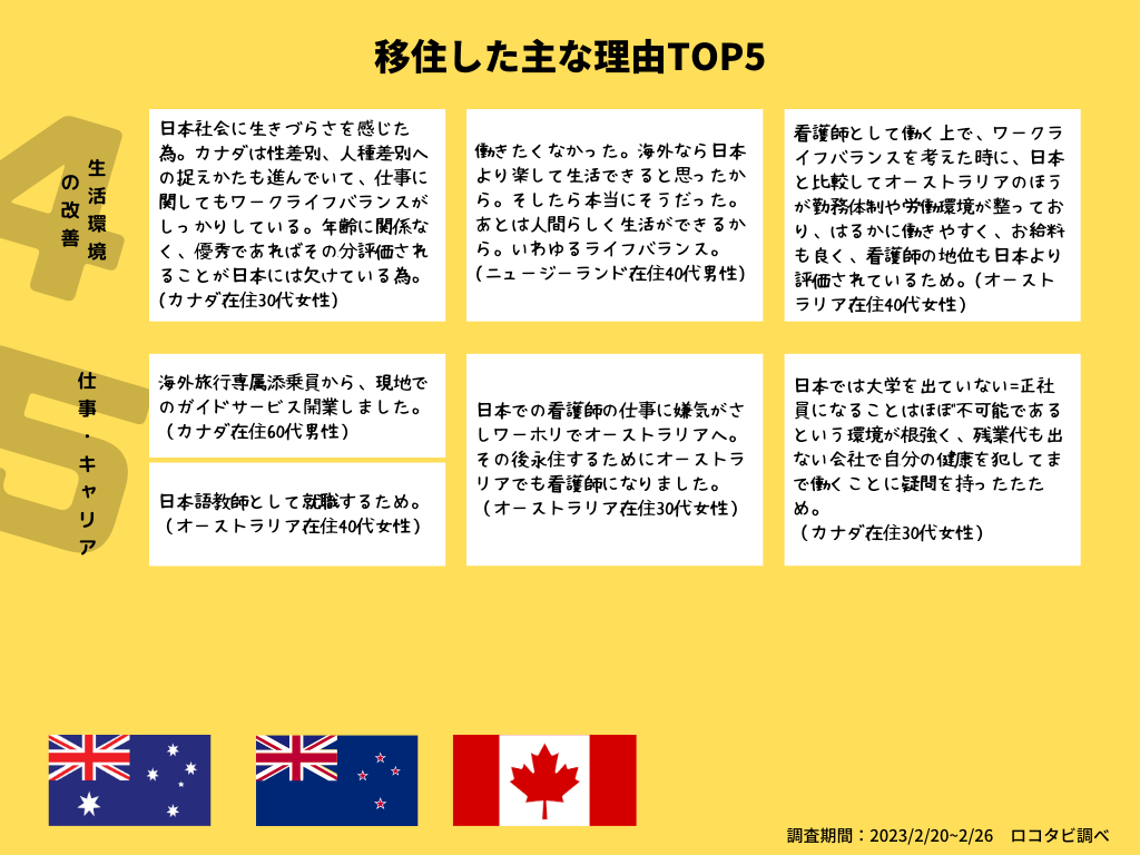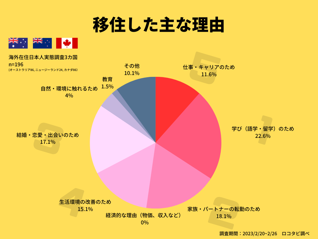 3カ国(オーストラリア・ニュージーランド・カナダ)に住む日本人196人に「移住の主な理由」を質問したところ、「学び(語学・留学)のため」(22.6%)、「家族・パートナーの転勤のため」(18.1%)、「結婚・恋愛・出会いのため」(17.1%)、「生活環境の改善のため」(15.1%)、「仕事・キャリアのため」(11.6%)。一方、「経済的な理由」は0%だった。