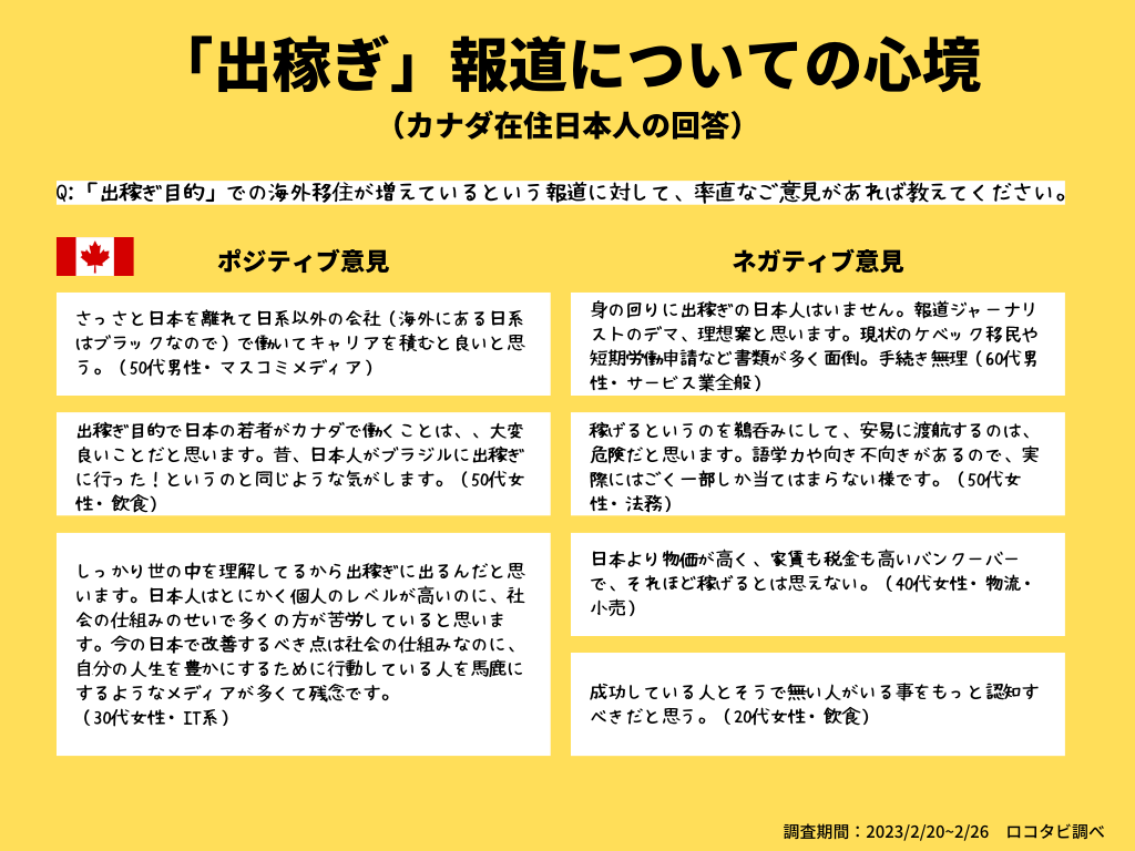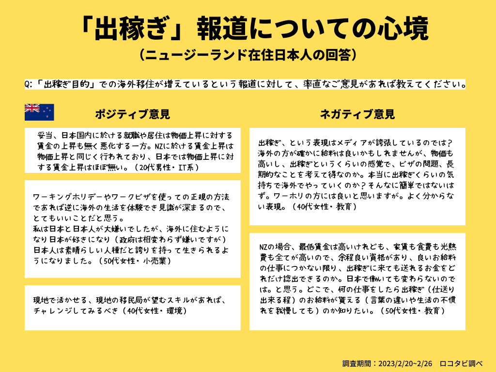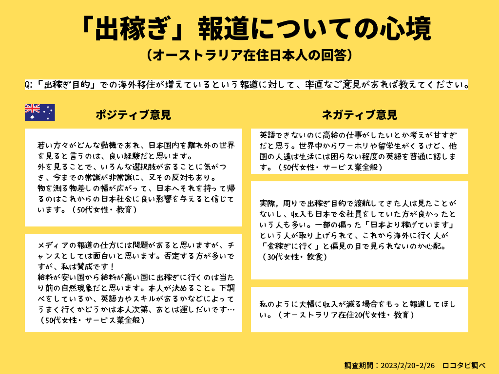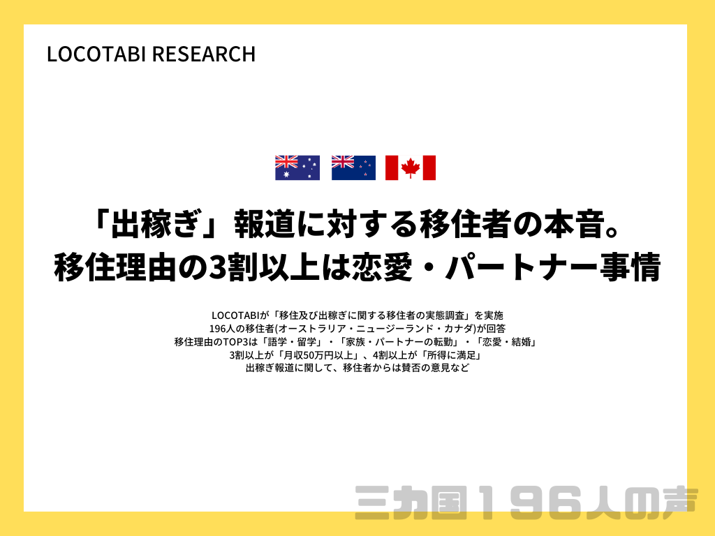 3カ国(オーストラリア・ニュージーランド・カナダ)に住む日本人196人に、自由記述で「『出稼ぎ目的』での海外渡航が増えているという報道に対して、率直なご意見があれば教えてください。」と質問したところ、9割以上の182人が記述回答を寄せてくれた。特に賛否の多かったオーストラリア(78人)の記述は全てnote(別URL)にてまとめた。▶︎ https://note.com/traveloco/n/n69eef957609f