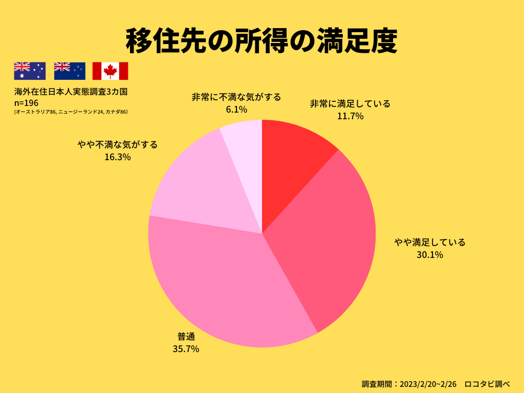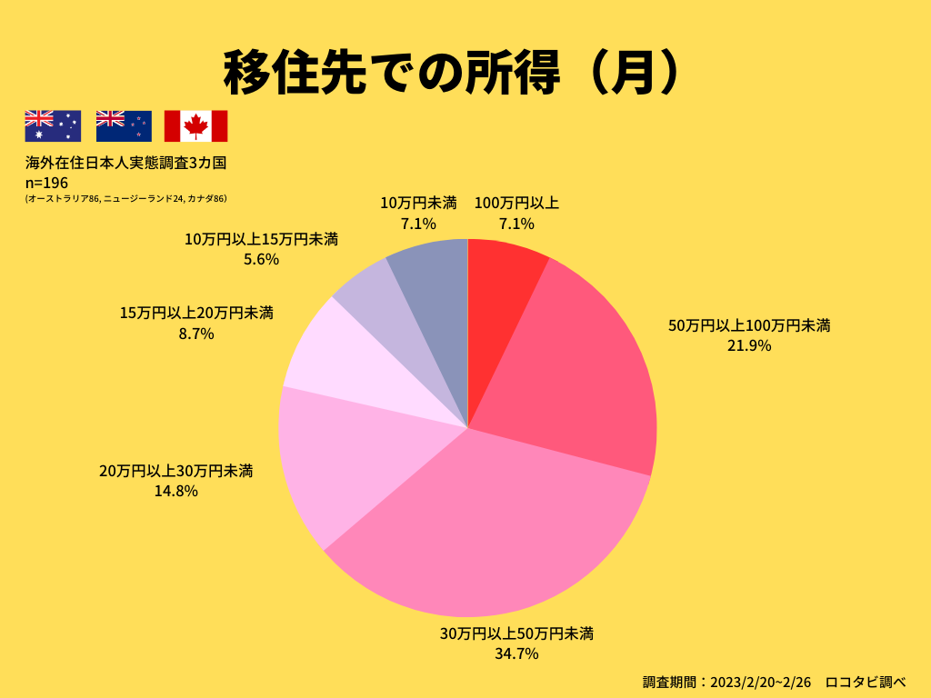 3カ国(オーストラリア・ニュージーランド・カナダ)に住む日本人196人に「移住先での月収」についてを質問したところ、「100万円以上」(7.1%)、「50万円以上100万円未満」(21.9%)、「30万円以上50万円未満」(34.7%)が最も多くの割合を占めた。また、同様の196人に「所得水準に対する満足度」を質問したところ、「非常に満足している」(11.7%)、「やや満足している」(30.1%)と4割以上が「満足している」と回答。