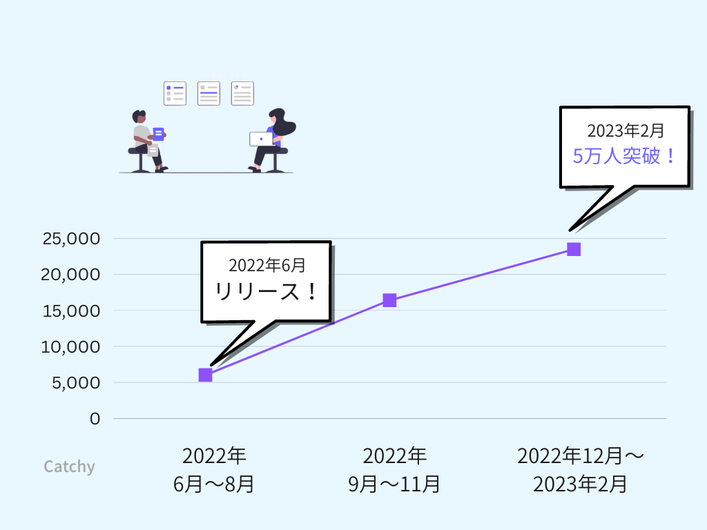 AI ライティングアシスタント「Catchy(キャッチー)」は、2022年6月にリリースしました。2023年2月下旬に会員数5万人を突破するまでに下記のような推移をたどりました。