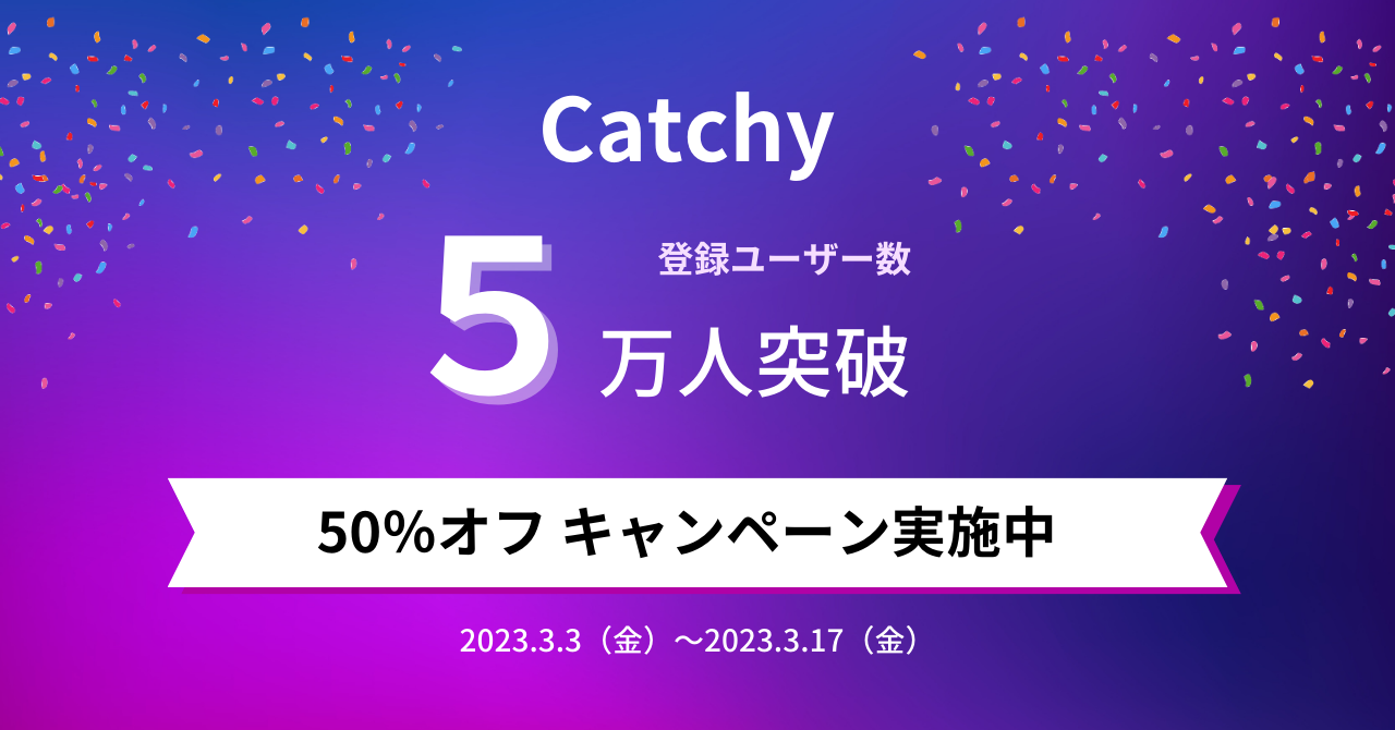 ・クーポンご利用方法:CatchyのStarterプラン・Proプラン(月額・年額)の契約時、もしくは単発クレジット購入時に、クーポンコード「CP50000」をご入力ください。