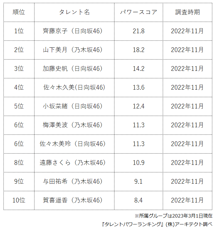 『タレントパワーランキング』では、タレントパワーランキングに登録されている坂道グループのスコアを調査。